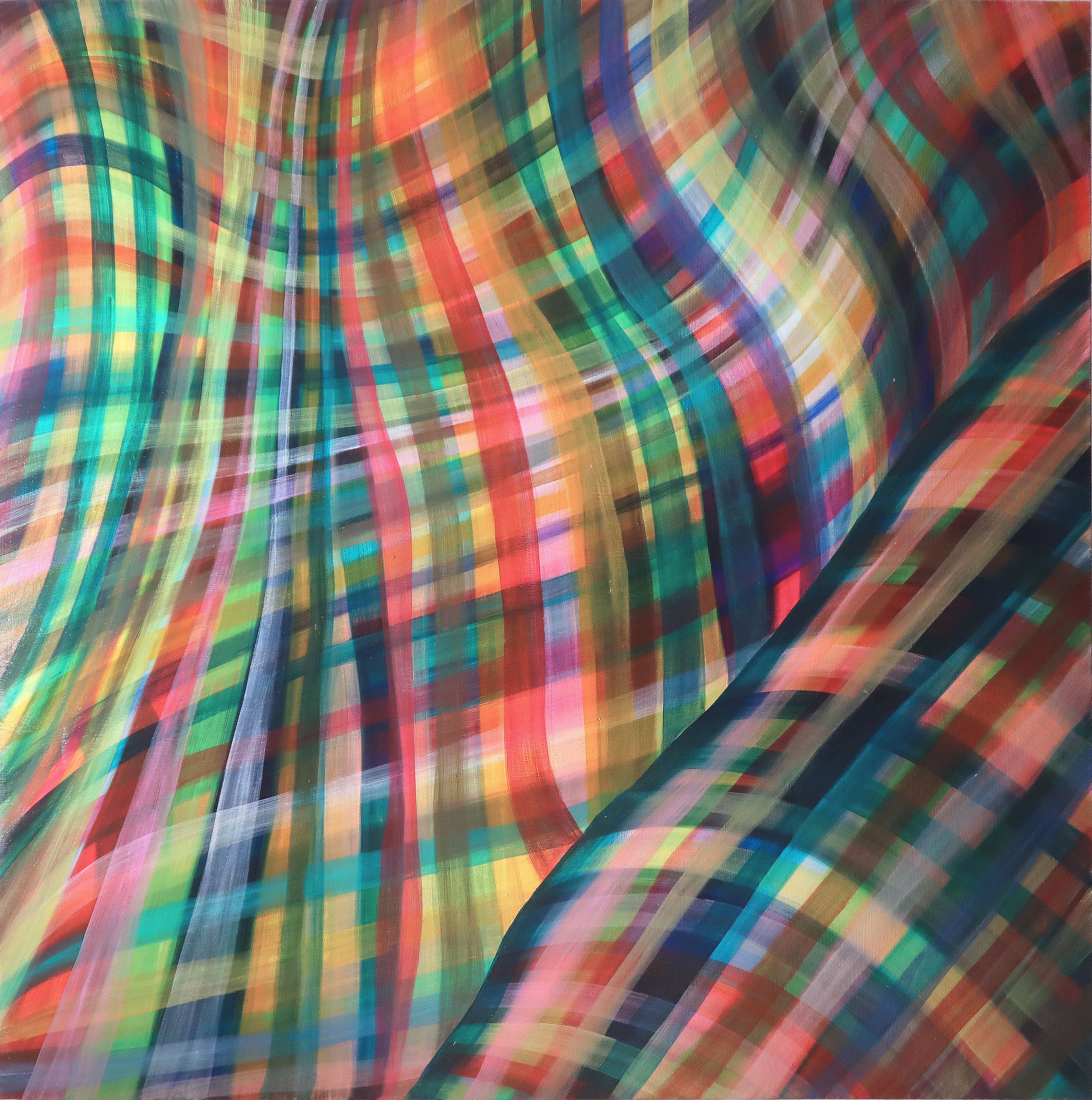 황정민 개인전 《데이지 체인》 서문 몸으로부터, 몸을 넘어 살아가기 홍예지 미술비평가 “내가 아닌 것은 내 흥미를 끌 수 없으며, 있는 그대로의 자신을 넘어선 존재가 될 수는 없다- 그럼에도 나는 정신이 혼미하지 않을 때에도 자신을 초월하며, 따라서 나는 거의 늘 나 자신을 넘어서 있다-. 내겐 몸이 있고, 내가 하는 모든 일은 내 시작으로부터 이어진 것들이다.” - 클라리시 리스펙토르 한 생에 하나의 몸, 여러 생에 여러 개의 몸. 그 몸들은 전부 ‘나’일까? 몸을 ‘나(self)’라고 부른다면 그건 무슨 의미일까? 누구를 위해 몸이 있는 걸까? 몸이 일종의 하드웨어라면 영혼은 소프트웨어다. PC에 소프트웨어 업데이트 알림이 뜨는 것처럼 우리 몸도 영혼을 업그레이드 하라는 알림을 받는다. 업데이트를 계속 미루면 어떻게 될까? 보안에 취약해지고 반복적인 오류가 발생한다. 우리 몸도 마찬가지다. 영혼의 성장을 거부하면 경험의 데이터를 정상적으로 인식하고 처리하는 데 지장이 생긴다. 그렇다면 몸에 설치된 영혼이 하는 일은 정확히 무엇인가? 몸이 쌓은 경험치를 지혜로 변환하는 일이며, 그 지혜를 보편적인 차원에 업로드해 다른 영혼과 공유하는 것이다. 이때 보편적인 차원은 실시간으로 갱신되는 공유 드라이브와 같다. 드라이브의 소유자가 누구인지 알 수 없지만, 이곳에 접근하고 편집할 수 있는 권한은 모두에게 있다. 각각의 영혼을 통해 공유 드라이브에 접속하는 몸들. 이 몸들은 개별적으로 존재하지만 서로 연결돼 있다. 어떻게? 여러 가지 모델을 상상할 수 있겠지만, 전시 제목인 ‘데이지 체인(daisy chain)’을 참조하기로 한다. 데이지 체인은 ‘연속적으로 연결된 하드웨어 장치들의 구성’을 가리킨다. 예를 들어, 장치 A, B, C를 연결한다면 A와 B를 연결하고 연속적으로 B와 C를 연결하는 방식이다. 이제 ‘하드웨어 장치’에 ‘몸’을 대입해보자. 몸A와 몸B, 몸B와 몸C… 이렇게 몸이 연이어 연결되며 하나의 체인을 이룬다. 체인을 구성하는 몸들 사이에는 교류가 일어난다. A가 B에게, B가 C에게 무언가를 건네며 영향을 주고받는다. 그 무엇은 몸이 살아온 역사이며 체화된 앎이고, 자전적 기억이며 승화된 고통이다. 또한 그 의미가 단숨에 읽히지는 않더라도 분명한 치유와 해방의 메시지를 담고 있다. 이 비유를 ‘타인’과 ‘나’의 연결에 한정할 필요가 없다. 더 과감히 밀고 나가자. 그 수많은 몸이 다 ‘나’일 수도 있지 않은가? 10년 전의 나, 지금의 나, 10년 뒤의 나처럼 말이다. 윤회를 믿는 사람이라면 전생과 현생과 후생을 연결할 것이고, 다중 우주를 믿는 사람이라면 서로 다른 차원에 연결된 채 살아가는 나를 떠올릴 것이다. 어느 쪽이든, 이 체인을 무한히 연장하면 ‘한 몸에 갇힌 나’란 존재하지 않는다는 사실을 알게 될 것이다. 그런 ‘나’는 없다. 다른 말로 하면 ‘무아(no-self)’다. 이 깨달음은 허무로 빠지지 않는다. 오히려 몸과 영혼의 오랜 불화를 극복하며 초월하는 길이 열린다. 황정민이 전개하는 회화는 이런 각성을 전제로 한다. 그는 ‘무(無)’를 두려워하지 않는다. 그는 작은 ‘나’를 ‘무’로 돌림으로써 억압에서 풀려난 에너지를 그린다. 그에게 그림은 이 비가시적인 에너지들이 뛰놀며 가시화되는 ‘장(場)’이다. 무에 대한 인식이 바뀌면 시공간에 대한 인식도 달라진다. ‘space-time’ 시리즈는 그가 경험한 공간-시간의 균열과 그 속에서 발견한 틈새를 보여준다. 격자무늬로 짜인 시공간에 푸르스름한 형체가 나타난다. 그 덩어리는 가로세로 줄이 교차하는 틈 위에 애매하게 떠 있다. 이 애매성, 경계를 흐리는 모호함은 무아의 상태로 넘어가는 과도기적 단계를 가리킨다. 한편, 황정민의 작업에서 무와 유는 단순히 ‘없음’과 ‘있음’이라는 이분법적 의미로 구분되지 않는다. 무는 정적이고 잠재적인 시공간이라면, 유는 그런 상태의 균형이나 침묵이 깨질 때 생겨나는 역동적인 시공간이다. 또한 ‘무에서 유’로 일방향의 변화가 일어나는 것이 아니라, ‘무에서 유, 유에서 무’로 끊임없이 순환하는 구조를 볼 수 있다. “우리는 무의 완벽한 대칭을 깸으로써 유를 만든다. 그것은 침묵을 깨뜨려 소리를 만들고, 흰 종이에 검은 줄을 긋고, 고요한 물에 물결을 일으키고, 에너지 마당[field]에 교란을 일으키는 것과 같다.” ‘Line’ 시리즈에서 황정민은 ‘흰 종이에 검은 줄’을 긋는 대신 캔버스에 초록, 노랑, 빨강, 분홍, 주황 등 다채로운 선들을 거듭 그려 서로 다른 에너지가 공존하는 상태를 그린다. 우리는 그의 화면에서 물결처럼 출렁이는 시공간을 본다. ‘Line’ 시리즈는 ‘space-time’ 시리즈와 유사하지만, 이제 애매모호한 형체는 어딘가로 사라지고 없다. 오직 굽이치는 힘들만 존재할 뿐이다. 작가는 이 물리적인 힘을 있는 그대로 감지하며 미적 유희를 벌인다. 여기서 ‘나’는 중요하지 않고 인식되지도 않는다. 말 그대로 무아지경이 펼쳐진다. 아무런 사건이 일어나지 않을 때, 무는 잔잔한 에너지 장과 같다. 무한한 잠재력을 품은 채 고요히 잠들어 있는 빈 공간. 어느 순간 균형이 깨지며 파동이 일고, 구멍을 통해 소리