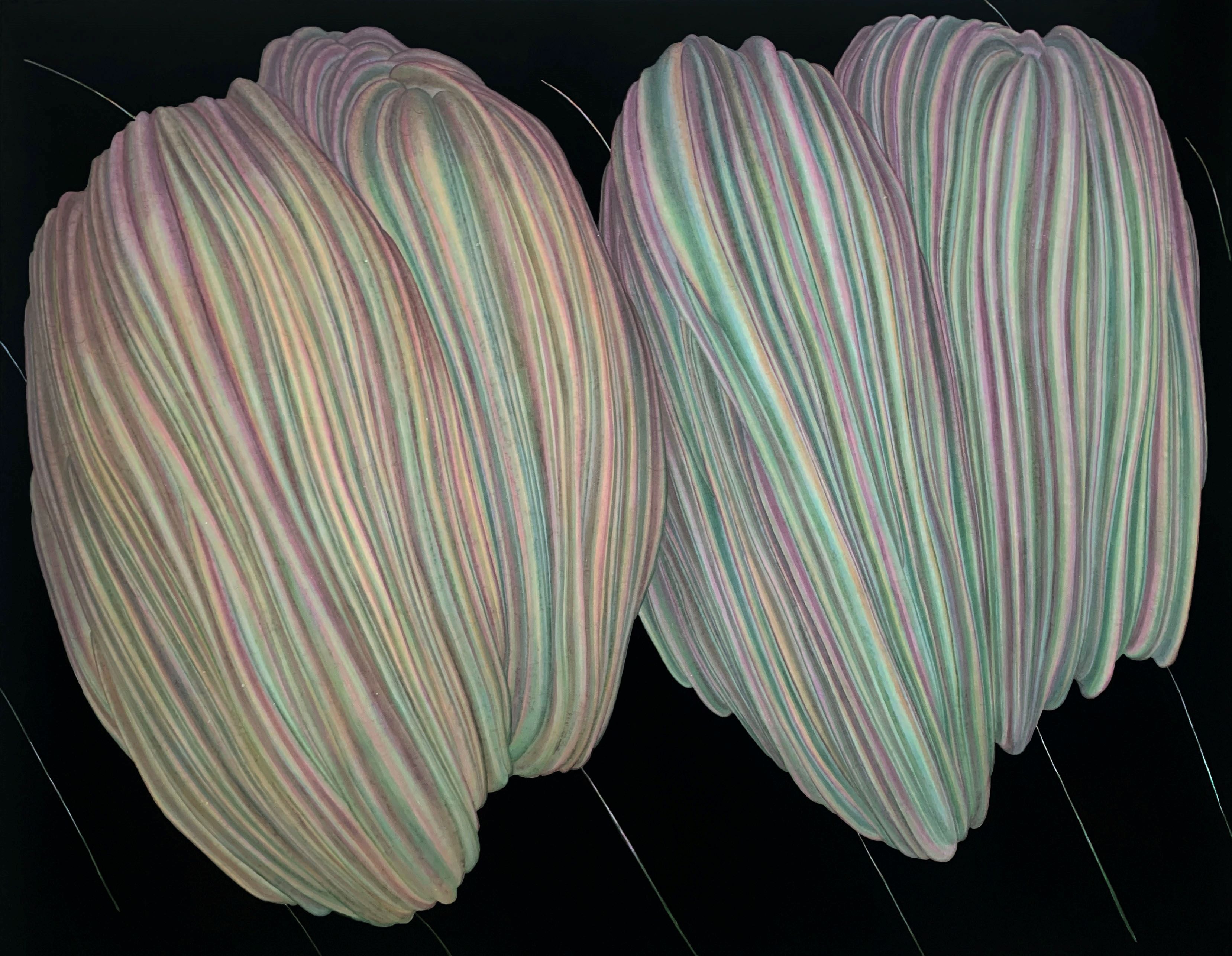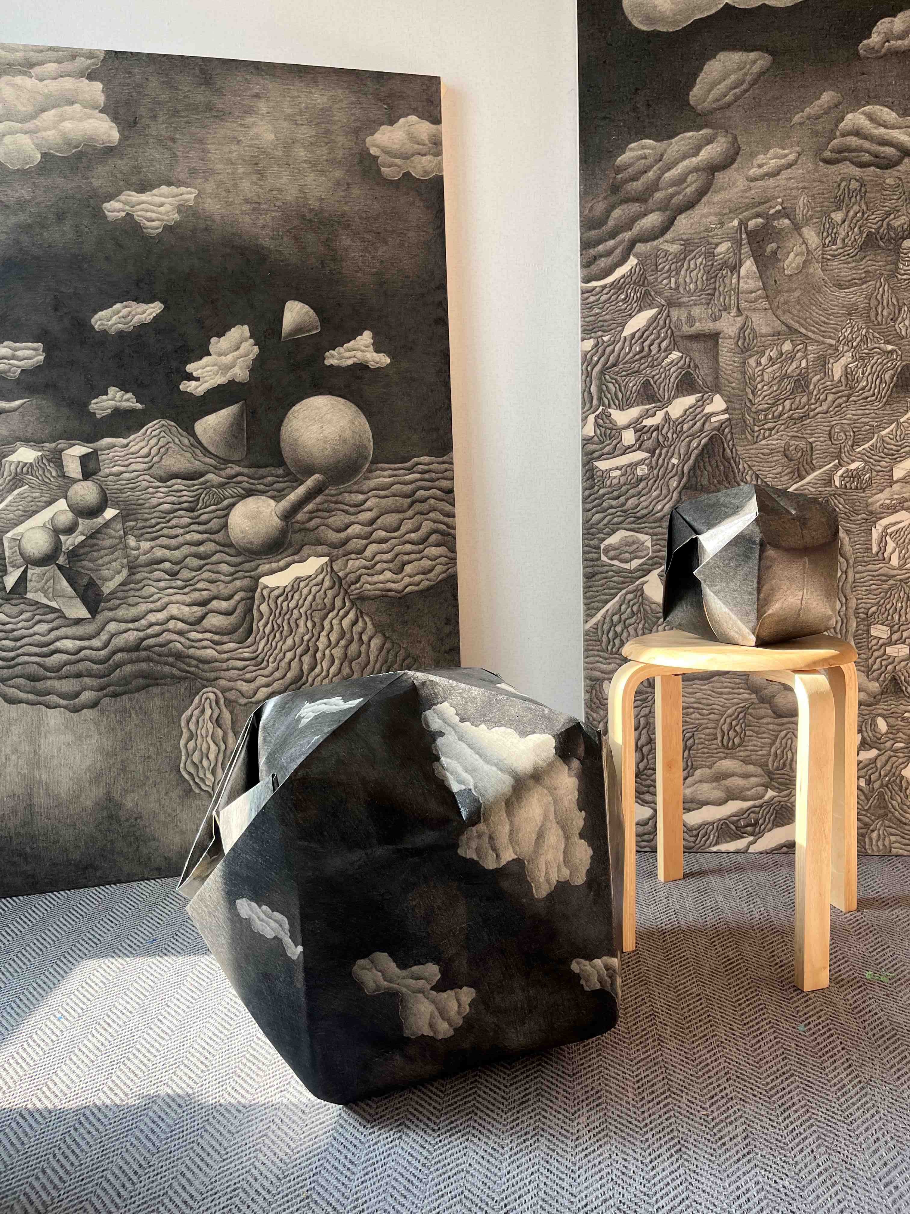 이현과 배윤재는 꿈과 같은 회화적 공간 안에서 모호한 덩어리를 만진다. 이현은 연필이라는 가장 기본적인 재료로 먹구름을 닮은 뿌연 장소를 만들어 낸다. 그에게 뿌연 장소란 가장 자신다운 공간이다. 배윤재는 가루 물감인 분채를 겹겹이 쌓아 미묘한 색의 “무엇이든 가능한 물체”를 그린다. 그에게 이 모호한 덩어리는 온도를 갖기 전의 중립적인 사물이자, 형상이 확정되지 않은 뿌연 움직임이다. 꿈은 날카롭지 않다. 그곳에서는 아픔이나 차가움, 뾰족함 같은 것들도 모호하게 번역된다. 그러니 꿈에서는 선명한 사진을 남길 수 없다. 흔들리거나 번진 장면만을 남길 수 있을 뿐이다. 최선을 다해 기억한다 한들 소용없는 일이다. 반드시 빠진 부분이 생기고 왜곡된다. 그 왜곡이, 비논리성이, 비확정성이 꿈의 질감이 된다. 꿈의 모호하면서도 부드러운 질감이 된다. 부드럽기 때문에 부드러운 것이 아닌, 날카롭고 선명한 것이 제거된, 중립적이며 건조한 부드러움이다. 이곳은 파편적이지만 봉제선을 찾을 수 없는 모호한 공간이다. 심지어 꿈에서는 수영을 할 때조차 차갑다기보다 부드럽다고 느낀다. 만약 차갑다면 잠에서 깰 시간이 다가왔다는 말이다. 잠에서 깰 시간은 언제인가? 지금은 아니다. 이현은 유년의 어떤 기억에서 시작한다. ‘그 날’은 뿌옇고 비가 올 것처럼 흐리지만, 조용하다. 마치 구름이 움직이는 소리가 들릴 것처럼 고요한 이 장소에는 단 한 명의 사람뿐이다. 그 사람이 어디에 있을지는 모르지만, 이곳 어딘가에 있다는 것은 분명하다. 그가 보이지 않는 곳에 자리 잡아 눈을 감고 있는 동안 이 장소에서는 많은 일이 일어난다. 아이가 서투르게 오려 붙여 둔 것처럼 고개를 삐뚜름하게 돌린 구름들이 서로 이야기를 나누는가 하면 땅도, 건물도, 자동차도 전부 구름으로 덮여 하나의 덩어리처럼 보이기도 한다. 사방이 구름이다. 구름이 된 마을은 이제 분명한 경계를 가지지 않는다. 나무는 집과 구분되지 않고, 땅은 하늘과 닮았다. 낮이지만, 이상하게 밤이기도 하다. 모든 것들이 모호하게 섞이는 동안 이 공간의 주인은 여전히 어딘가에 숨어 있다. 그는 속삭인다. 기도를 하는지도, 놀이를 하는지도 모르겠다. 그에게 구름은 간절한 기원처럼 보이기도 하고, 순진한 유희의 결과물로 보이기도 한다. 사실 이 자에게 기도와 놀이는 크게 다르지 않다. 마치 불안과 유희가 동전의 양면처럼 붙어 있듯이, 이 공간의 주인은 구름을 빚어내며 신자이면서도 마법사가 된다. 그렇게 세상에서 가장 안전한 곳, 흐리기 때문에 즐거운 곳이 만들어진다. 한편 배윤재는 신자도 마법사도 아니다. 그는 관찰자다. 그는 길게 시간을 두고 관찰한다. 일상적인 공간 안에서, 시간을 길게 늘이는 것만으로도 그는 회화적인 공간에 진입한다. 길게 관찰하면 사물의 전생부터 잠재태까지 한 번에 관찰할 수 있다. 그곳에서 사물은 씨앗에서 선인장으로, 그리고 사막의 사구로, 바다의 파도로, 선박의 흔들리는 그림자에서 다시 씨앗으로 돌아온다. 사물은 일렁인다. 배윤재가 관찰하고 그린 것은 일렁이는 사물이라기보다는, 사물의 일렁임이다. 이것을 아지랑이라고 부르면 어떨까. 배윤재는 사물의 아지랑이를, 미묘한 흔들림을 그려낸다. 덕분에 사물은 그 외곽선이 닫힌 상태에서도 끊임없이 움직인다. 뼈대 없이, 내부가 표면이 되고 다시 표면이 내부가 되는 이 사물은 공간적으로 고정된 상태에서도 ‘움직인다’. 무엇이든 가능하다는 작가의 호언장담은 단지 사물의 생김새를 관람객의 상상력에 맡기겠다는 말은 아니다. 이 물체는 실제로도 움직이거나 흔들리고 있으며, 그렇기 때문에 어떤 물체도 될 수 있는 미묘한 상태가 된다. 확정 지을 수 없는 형태를, 딱 집어 말할 수 없는 색을 가진다. 그러나 먹구름도, 아지랑이도 모호한 것에서 끝나지만은 않는다. 먹구름은 비를 부르고, 아지랑이는 뜨거움의 전조다. 이들은 어떤 거대한 움직임의 일부일 뿐이다. 달리 말하자면, 모호함은 연극 무대의 구불구불한 커튼처럼, 음식을 덮어 둔 천처럼, 얼굴을 가리는 베일처럼, 그 뒤에 무언가를 감추어 둔다. 그 뒤에는 무엇이 올까? 이현의 ‘안전한 구름’은 심상치 않은 사건의 전조일까? 배윤재의 일렁임은 폭발적인 생명력을 암시하는가? 뿌옇거나 부드러운 장막 뒤에는 무엇이 기다리고 있을까? 사실 아무것도 기다리고 있지 않을 수도 있다. 이현의 세계는 영원히 구름 낀 세계일 수도 있고, 배윤재의 세계는 영원히 “뭉쳐졌다가 팽창하”기만 할 수도 있다. 앞으로 어떻게 될지는 모를 일이다. 그러나 그 모른다는 사실 덕분에 우리는 건조하고 부드러운 장막 뒤에 무엇이든 감추어 둘 수 있다. 꿈에서 깨기를 기다리면서, 모호한 표면에 둘러싸여서. - 정영수 비평가 (출처 = 히피한남)