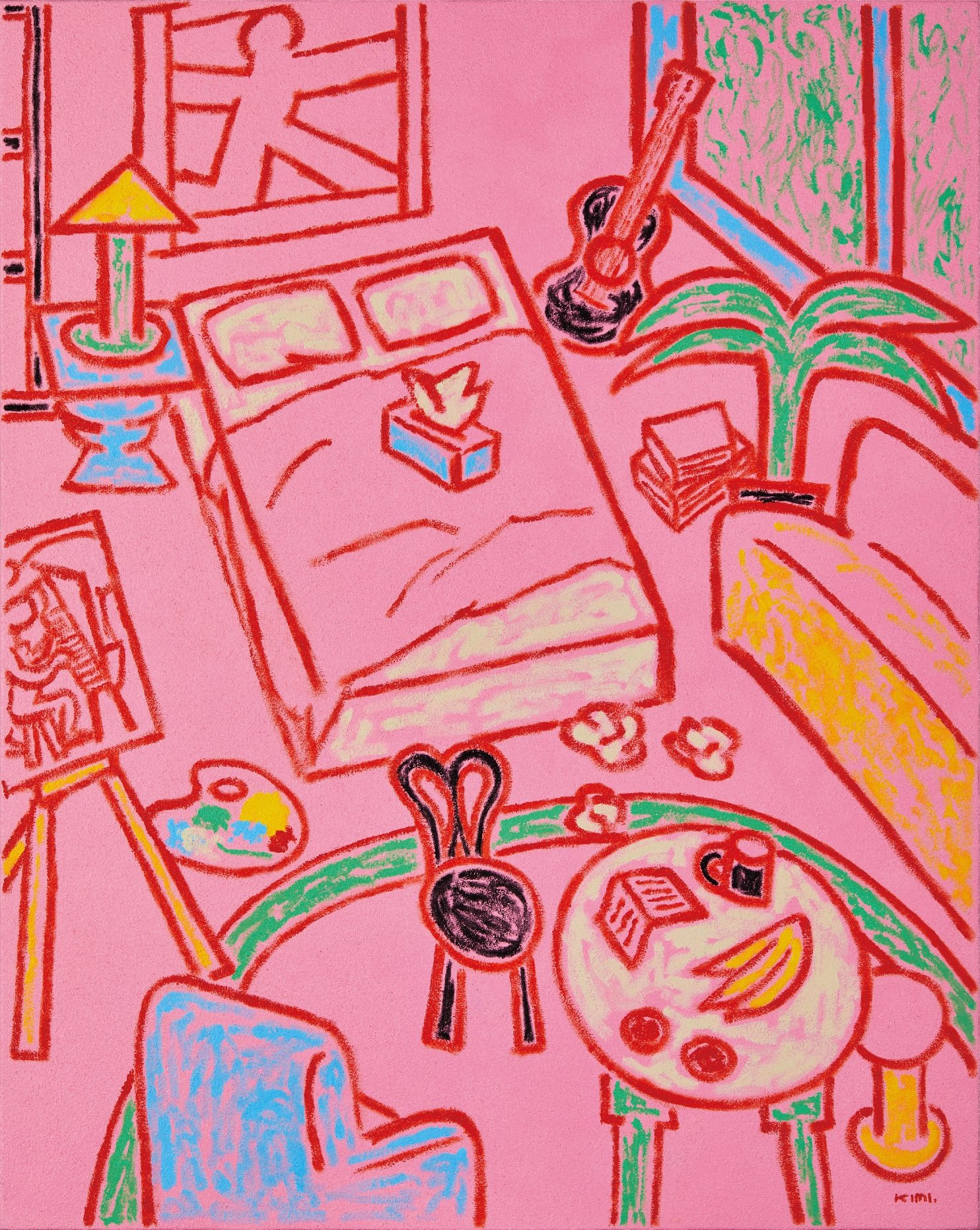 키미는 울산의 공장지대에서 자랐다. 길게 늘어선 공장 맞은편 주거단지에서 어린 시절을 보낸 작가는 틈만 나면 공장 반대편의 동산으로 향했다. 작가는 공장에서 최대한 멀어지고 싶었다며, 그때부터 풀이며 물이며 자연이 좋았다고 한다. 어쩌면 지금 그리는 그림들이 공장 반대편에 있는 것들에 대한 얘기일지도 모른다고 말한다. 그로부터 많은 시간이 지나고 이제 키미 작가는 부산에 산다. 그의 집을 방문하는 사람마다, 여기가 어느 나라인지 모르겠다며 신기해한다. 알록달록하고 어린아이 같은 패턴이 사방에 걸려있다. 식물이 많다. 책 사이에 풀 인형이 끼워져 있다. 작가를 둘러싼 모든 것이 선명하다. 선명하다는 건, 지금 해가 강하다는 말이다. 정오이거나 한여름처럼, 혹은 잘 익은 과일처럼 모든 것이 선명하다. 그가 원했던 것은 잘 익은 과일처럼 선명한 세상인 것 같다. 공장에서 멀리 떠나온 국적 없는 세상이다.