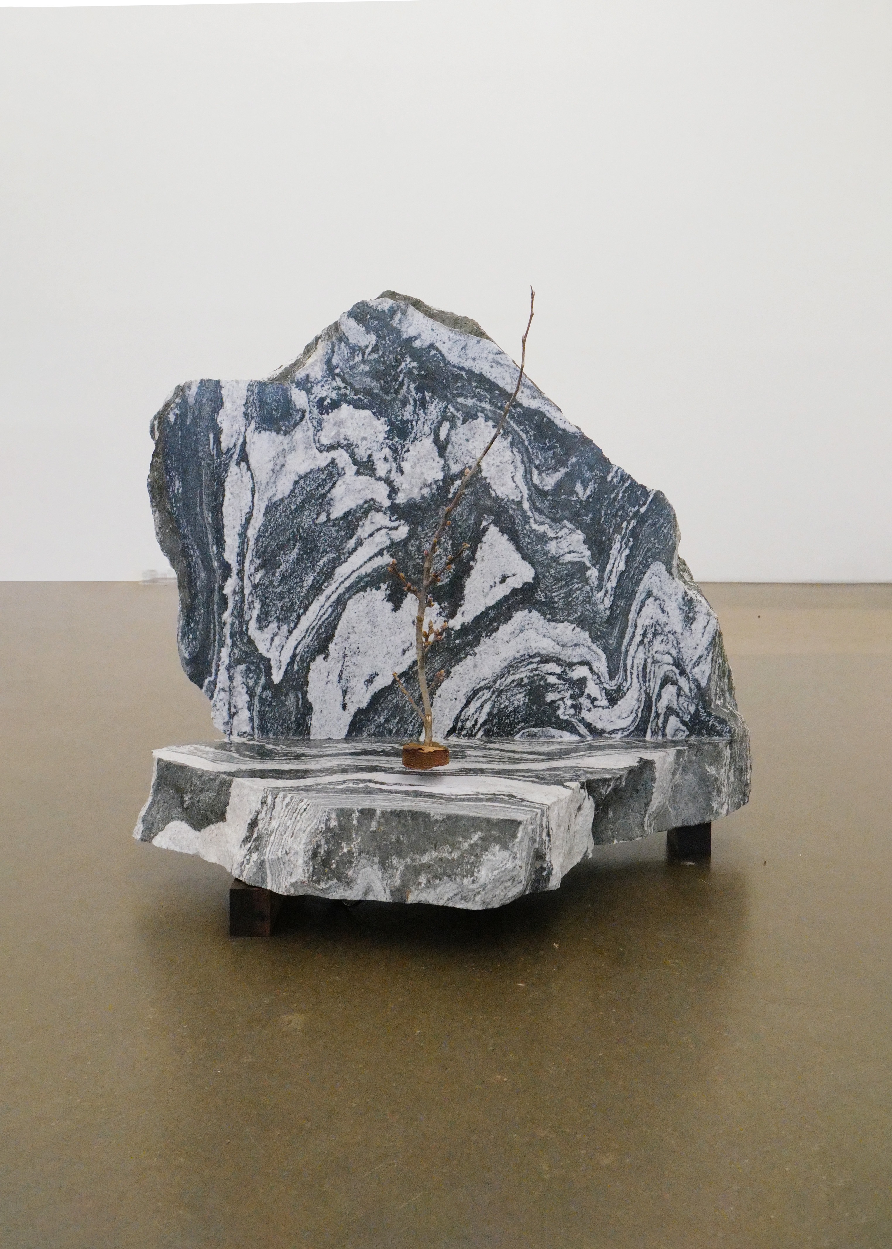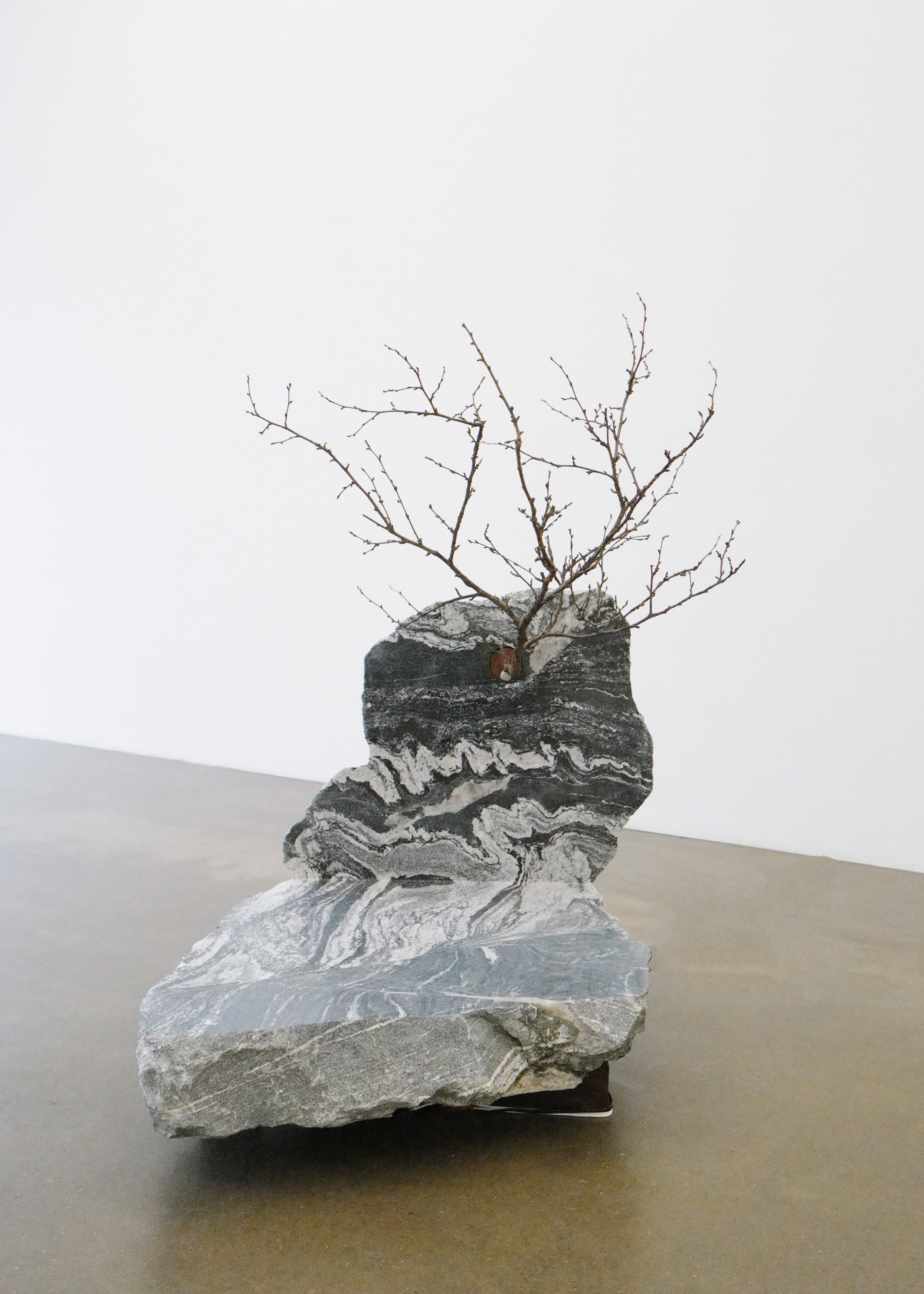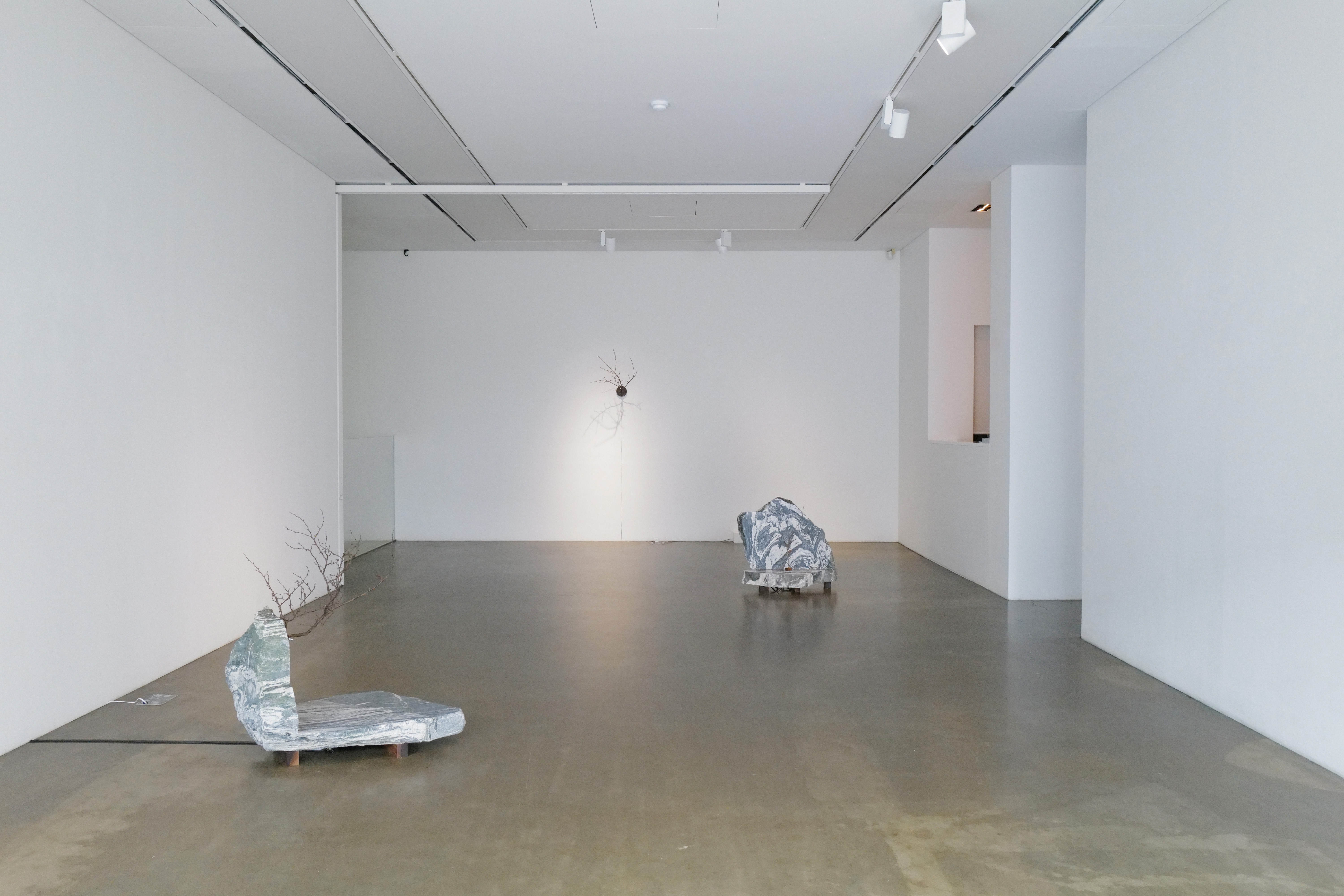 아트사이드 갤러리에서 11월 15일까지 진행되는 유화수 개인전 <경관 보류>는 흙이 아닌 돌에서 가지를 뻗어낸 기이한 조각으로 시작한다. 나뭇가지에 가까이 다가가면 인간의 존재를 의식하듯 파르르 떨리는데, 이미 죽음에 이른 가지들은 기계 장치를 통해 생명을 연명한 듯한 모습을 보인다. 지하로 진입하면 낯설음은 그 규모만큼이나 크게 다가온다. 익숙한 가로등에 전구 대신 가는 목련 가지가 들어가 있고, 본래 하나의 기둥이 되어야 하는 나무는 다른 수종이 분절되어 하나의 수직적 기둥을 이룬다. 한 켠에는 매끄러운 유리 구슬과 우리가 걸어다니는 아스팔트가 동그랗게 말려 있다. 전시장은 그 자체로 낯설게 조경된 정원을 형성한다. 이번 전시를 통해 작가는 인간의 끝없는 욕망을 떠받치며 쉼 없이 달리던 도시의 경관에 잠시 노란 불을 켠다. 인간이 인위적으로 선택하고 잘라내고 있던 자연의 일부를 보류하는 것이다. 경관은 단순한 자연의 모습이 아니다. 그것은 사회적 관계와 권력 구조가 시각적으로 구현된 결과물이다. 따라서 우리가 보는 경관은 객관적 사실이 아니라 특정 계층의 미적, 경제적 욕망을 반영한 “인위적 구성물”인 것이다. 유화수는 그간 인간에게 지극히 유효한 효용성, 그리고 그 과정에서 소외된 존재들을 작업을 통해 떠올리고 그 의미를 회복할 수 있는 작업을 지속해왔다. 그의 관심사는 우리가 발 딛고 사는 땅을 덮어내 무언가를 건설하는 행태인 건설업에서 출발해 장애, 기술(technology), 특히 자연을 인위적으로 재배하는 스마트팜으로 뻗어나갔다. 이번 전시에서 그는 ‘조경’을 주제로 만들어낸 쓸모 없음의 연립(聯立) 속에서 조각조각 흩어진 채 인간의 의도를 벗어나 자율적으로 존재하는 순간들을 기록한다. 이 가운데 눈여겨볼 만한 재료는 유리와 아스팔트다. 매끈하게 다듬어진 유리는 광물로서 데이터의 매개체이자 정보가 시각적으로 번역되는 표면이 된다. 동시에 투명성이라는 속성은 보이는것과 보이지 않는 것을 조율하는 매개체로서 감시 권력의 상징이 되기도 한다. 아스팔트는 석유를 정제하는 과정에서 가장 하단에 남겨지는 물질이다. 휘발성이 강한 연료들과 달리 화석 연료의 정체성을 고스란히 간직한 아스팔트는 본래의 자연을 덮어 인간이 통행하기 편한 길로 바꾸며, 인간과 자연의 경계를 시각적·물리적으로 구분 짓는 도구가 된다. 전구가 있어야 할 자리에 화강암이나 연약한 목련 가지가 들어간 가로수는 어떠한가. <집으로 가는 길>이라는 제목을 지닌 이 작품은 계절성을 가장 잘 드러내기에 인간의 곁에 꺾여있던 목련과 가공된 돌을 주인공으로 올린다. 이들이 밝히는 빛은 어두운 시절 인간이 돌아가는 길을 밝혀주는 낭만적인 단어를 해체하며 새로운 방식으로 문제를 화두에 올린다. 이처럼 유화수의 전시는 삶과 죽음, 기념과 무의미, 돌봄과 통제 사이에서 끊임없이 경계를 오가며 우리가 ‘경관’이라 부르는 것이 사실은 권력과 자본이 설계한 질서임을 드러낸다. 그 안에서 자연은 이미 사회적 상징으로 가공된 상태임을 은밀하게 폭로하는 것이다. *출처: 아트사이드 갤러리