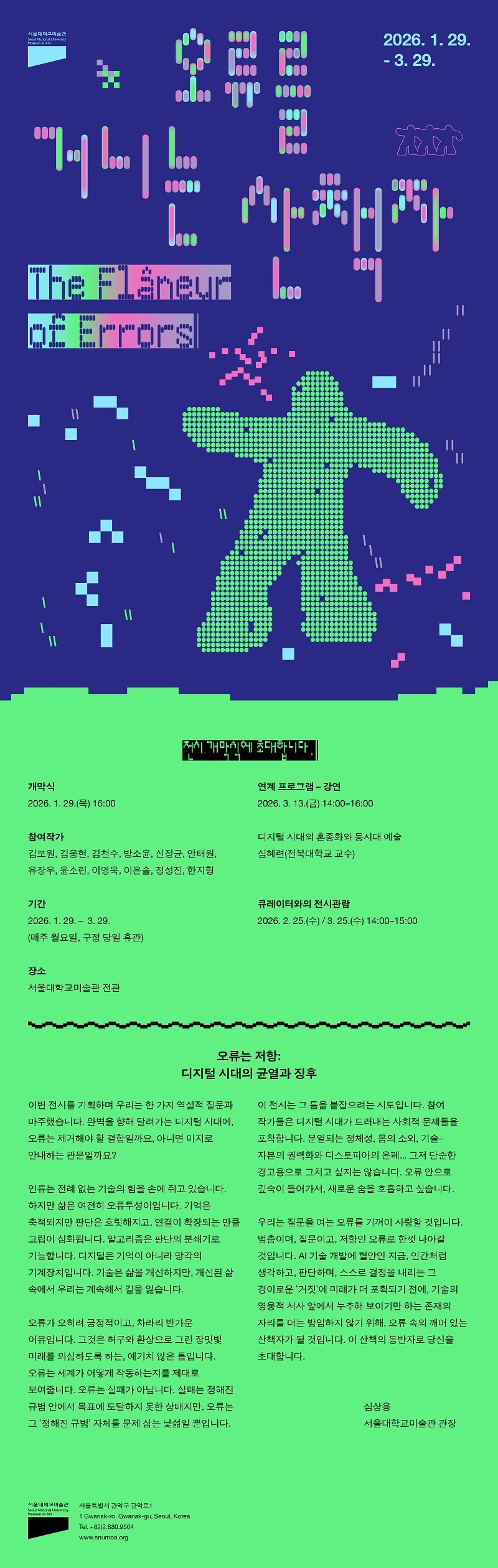 오류는 저항: 디지털 시대의 균열과 징후 심상용(서울대학교미술관 관장) 이번 전시를 기획하며 우리는 한 가지 역설적 질문과 마주했다. 완벽을 향해 달려가는 디지털 시대에, 오류는 제거해야 할 결함인가 아니면 미지로 안내하는 관문인가? 인류는 전례 없는 기술의 힘을 손에 쥐고 있다. 하지만 삶은 여전히 오류투성이다. 기억은 축적되지만 판단은 흐릿해지고, 연결이 확장되는 만큼 고립이 심화된다. 알고리즘은 판단의 분쇄기로 기능한다. 디지털은 기억이 아니라 망각의 기계장치다. 기술은 삶을 개선하지만, 개선된 삶 속에서 우리는 계속해서 길을 잃는다. 오류가 오히려 긍정적이고, 차라리 반가운 이유다. 그것은 허구와 환상으로 그린 장밋빛 미래를 의심하도록 하는, 예기치 않은 틈이다. 오류가 세계가 어떻게 작동하는지를 제대로 보여준다. 오류는 실패가 아니다. 실패는 정해진 규범 안에서 목표에 도달하지 못한 상태지만, 오류는 그 ‘정해진 규범’ 자체를 문제 삼는 낯섦일 뿐이다. 이 전시는 그 틈을 붙잡으려는 시도다. 참여 작가들은 디지털 시대가 드러내는 사회적 문제들을 포착한다. 분열되는 정체성, 몸의 소외, 기술-자본의 권력화와 디스토피아의 은폐... 그저 단순한 경고용으로 그치고 싶지는 않다. 오류 안으로 깊숙이 들어가서, 새로운 숨을 호흡하고 싶다. 우리는 질문을 여는 오류를 기꺼이 사랑할 것이다. 멈춤이며, 질문이고, 저항인 오류로 한껏 나아갈 것이다. AI 기술 개발에 혈안인 지금, 인간처럼 생각하고, 판단하며, 스스로 결정을 내리는 그 경이로운 ‘거짓’에 미래가 더 포획되기 전에, 기술의 영웅적 서사 앞에서 누추해 보이기만 하는 존재의 자리를 더는 방임하지 않기 위해, 오류 속의 깨어 있는 산책자가 될 것이다. 이 산책의 동반자로 당신을 초대한다. *출처 및 제공: 서울대학교 미술관