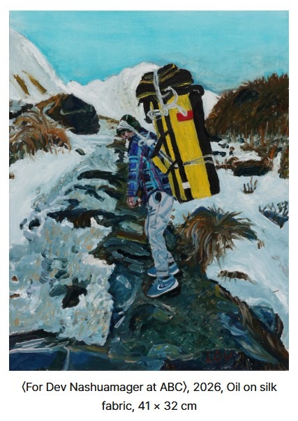 신의 땅: 히말라야 두 번의 여행으로 채워낸 ‘내면의 꽉 참’ 작가는 이번 전시를 위해 히말라야를 두 차례 방문했다. 첫 번째 여행에서 8일간 짧은 트레킹을 마친 후 전시에 대한 아쉬움을 느낀 작가는 스스로 만족할 수 있는 전시를 열기 위해 다시 네팔행 비행기에 올랐다. 한국으로 돌아온 작가는 “이제야 ‘내면의 꽉 참’을 느낄 수 있다. 신이 만들어 낸 히말라야를 온전히 그려낼 자신감이 생겼다”며 작품에 대한 강한 확신을 드러냈다. 새벽 텐트 밖으로 마주한 경이로운 대자연 이번 전시에서 눈길을 끄는 것은 히말라야의 웅장한 해돋이를 담은 작품이다. 오스트레일리안 캠프에서 새벽 동틀 녘을 맞이한 작가는 안나푸르나 남봉 Annapurna South에서 람중히말 Lamjung Himal로 끝없이 이어지는 산맥의 실루엣 너머로 떠오르는 태양을 화폭에 생생하게 옮겼다. 새벽의 쌀쌀한 공기, 숲의 향기 그리고 살아 있음에 대한 감사함이 화면을 통해 고스란히 전해진다. 자연 속 삶의 온기와 길을 그리다 작가는 웅장한 자연뿐만 아니라 그 속에 녹아 있는 현지인들의 삶과 문화도 섬세하게 포착했다. 예를 들어 작가는 히말라야 트렉킹 코스 곳곳에 길을 알리기 위해 나무에 흰색과 푸른색 표식을 남긴다는 사실을 알게 되었다. 이에 작품 속 푸르거나 하얀 색채는 강 같은 자연적 요소로 볼 수 있으면서도 자신이 나아가야 할 방향성의 은유라고 이해할 수 있다. 히말라야 어디서든 볼 수 있는 소박한 티 하우스에서 소녀가 찻잔을 건네는 모습 등 현지인들의 삶을 각양각색으로 생동감 있게 그려냈다. 작가는 “자연보다 인물을 그릴 때 더 긴장된다. 그 인물이 가진 감정과 체온을 작품에 그대로 가져와야 하기 때문”이라고 설명했다. 언어를 넘어선 교감, 셰르파 소년과의 우정 작품 속 따뜻한 시선은 작가가 현지 사람들과 나눈 깊은 교감에서 비롯되었다. 곤란한 상황에 부닥친 작가를 도와준 셰르파 청년 ‘수바쉬 Subash’와의 일화가 대표적이다. 작가는 “세탁물이 없어서 곤란한 상황에 부닥쳤을 때 우연히 만난 수바쉬는 몇 시간 동안 고생하면서 일을 도왔다. 이 과정에서 수바쉬가 한국어를 유창하게 한다는 걸 알게 되어 놀랐다. 그는 한국에 오고 싶어서 열심히 배웠다고 했는데 나중에 꼭 다시 만났으면 좋겠다”라고 전했다. 청년과 작가는 국적과 언어를 넘어 진정한 친구가 되었고 인간적인 애정과 감사의 마음은 이번 전시를 관통하는 중요한 정서적 배경이다.