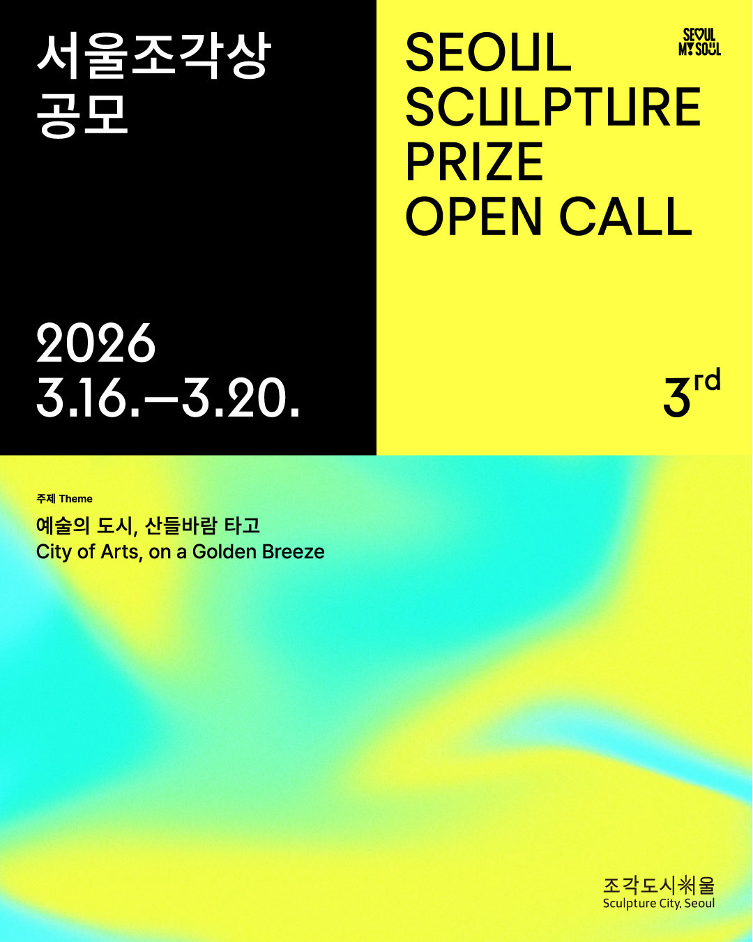 서울특별시는 도시 전체를 거대한 예술적 영감의 장으로 전환하는 <조각도시 서울> 프로젝트를 통해 세계적인 문화예술도시로 도약하고 있습니다. 조각 예술의 경계를 확장하고 동시대적 감각과 상상력을 담은 작품을 발굴하고자 제3회 서울조각상을 공모하오니 역량 있는 작가 여러분의 깊은 관심과 적극적인 참여 바랍니다.