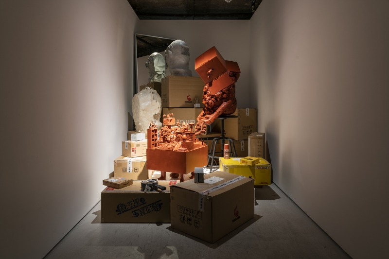 2019 figure, wood, spray paint, resin, urethane foam, paper box, industrial product 145x50x60cm, 70x44x44cm
