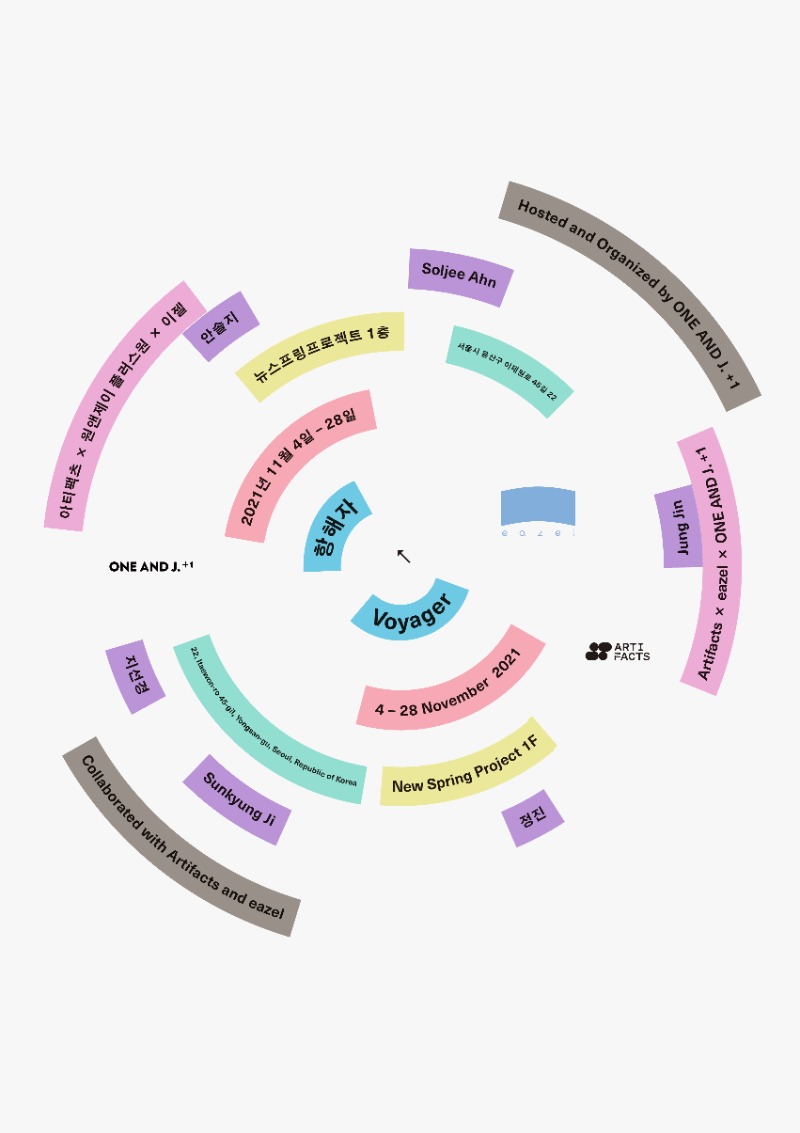 11월 4일부터 뉴스프링프로젝트에서 원앤제이플러스원의 2년만의 새 전시 <항해자>를 관람하실 수 있습니다. 원앤제이 갤러리는 2016년부터 젊은 예술가를 지원하고 다양한 예술적실험을 하고자 프로그램 '원앤제이플러스원'을 운영해오고 있습니다. 원앤제이플러스원은 미술 생태계의 변화에 유연하게 반응하는 온라인 미술 플랫폼 '아티팩츠'와 '이젤'의 진취적인 역할에 주목하고, 온라인 플랫폼 기반으로 활동한 이들을 오프라인 전시 공간으로 초대합니다. '미술 생태계의 선순환을 구축하는 환경이자 미디어'라는 공통된 비전을 공유한 아티팩츠, 원앤제이플러스원, 이젤은 전시 전반에 걸쳐 촘촘하게 연결됩니다. 협업으로 마련된 새로운 전시 환경 속에서 안솔지, 정진, 지선경 작가의 작품을 선보입니다. 다양한 레이어를 바탕으로 독특한 시각언어를 선보이는 작가 3인은 3개의 플랫폼과 유기적으로 연결됩니다. 협업 : 아티팩츠, 이젤 기획 및 주관 : 원앤제이 플러스원 *별도의 오프닝 리셉션은 진행하지 않습니다. *사전 예약 없이 전시를 관람할 수 있습니다. *문의: 원앤제이 갤러리 (02-745-1644, info@oneandj.com) (출처 = 뉴스프링프로젝트,원앤제이갤러리)