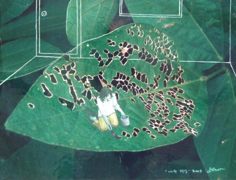 2018년 #쓸데없이아이처럼 프로젝트 세 번째 전시는 김미형 작가의 개인전입니다. <나의 미래>는 김미형 작가가 2005년부터 올 2월 까지 세 차례에 걸쳐 발표한 작품들을 정리하여 다시 소개하는 전시입니다. 김미형 작가는 벌레에 의해 구멍이 뚫린 마른 나뭇잎이나 죽은 곤충의 날개를 작품으로 재탄생시킵니다. 나뭇잎이나 벌레는 생물학적으로 생을 마감한 상태이며 남은 흔적도 서서히 사라져가는 중입니다. 전시 제목인 ‘나의 미래’는 죽음을 피할 수 없는 인간의 운명을 말하고 있습니다. 작품은 다른 생명체이지만 그들의 소멸을 통해 살아있음에 대한 진지한 사색을 제안합니다. 있음에서 없음으로 자연스러운 과정을 밟는 나뭇잎과 곤충들의 모습, 그에 더해진 작가의 손길이 다양한 메시지를 전달합니다. 전시작은 콩잎을 캔버스 천위에 바느질로 고정한 <찰나>연작, 죽은 잠자리의 날개를 종이위에 붙이고 드로잉 한 연작, 마른 나뭇잎으로 반 고흐, 반가사유상, 프리다 칼로 등 인물을 표현한 <인물-명화>연작 등 80여 점입니다. 김미형 작가는 회화를 전공했으나, 다양한 재료와 형식을 통해 작품을 제작했습니다. 그러한 다양한 형식을 관통하는 한 가지 공통점은 ‘구멍 뚫기’입니다. 초기 작품 중 탁구공에 ‘삶’이라는 글자를 작은 구멍 흔적을 내어 새겨놓은 작업 이후 ‘구멍’은 그의 작품의 주제와 연결된 중요한 형식이 되었습니다. 구멍은 이편과 저편을 연결하는 방식으로, 평탄한 어떤 것에 생기는 균열이나 상처, 흠집 등을 상징하였습니다. 삶과 죽음과 같은 철학적 명제에 대한 관심을 이어나가던 작가는 땅에 떨어진 마른 나뭇잎에 만들어진 구멍들-벌레 먹거나 비와 바람과 햇빛에 의해 만들어진-을 문득 새로운 눈으로 보게 되었습니다. 그것은 구멍이라기보다는 그 존재가 점점 비워져가는 자연 그 자체의 모습이었고 작가는 자신이 인위적으로 만들어내는 구멍보다 훨씬 더 진정성 있는 모습이라고 여겼습니다. 이후 직접 구멍을 뚫거나 구멍을 이용해 작품을 만들기보다는 떨어진 나뭇잎을 주워 그 나뭇잎의 형상을 통해 떠오르는 이야기를 작품으로 만들어내기 시작했습니다. 나뭇잎들을 천위에 바느질로 고정시켜서 ‘날개’의 모양을 만들기도 하였고, 종이위에 붙여 사람의 형상을 만들기도 하였습니다. 나뭇잎의 모양에 연결하여 그림을 그려서 작품을 만드는 예술가의 모습, 사랑하는 사람들의 모습을 나타내기도 했습니다. 김미형 작가가 만들어내는 이야기는 사람들의 삶에 대한 것이었고, 그 기초가 되는 나뭇잎이나 죽은 잠자리의 날개는 그 이야기도 결국은 끝이 있다는 것을 전달하였습니다. 불가피한 미래인 ‘소멸’을 잊지 않고 살아갈 때 인간이 삶을 조금 더 겸허하고 진실하게 살게 될 수 있지 않을까 하는 생각이 작가의 바람입니다. ■ 이상원미술관