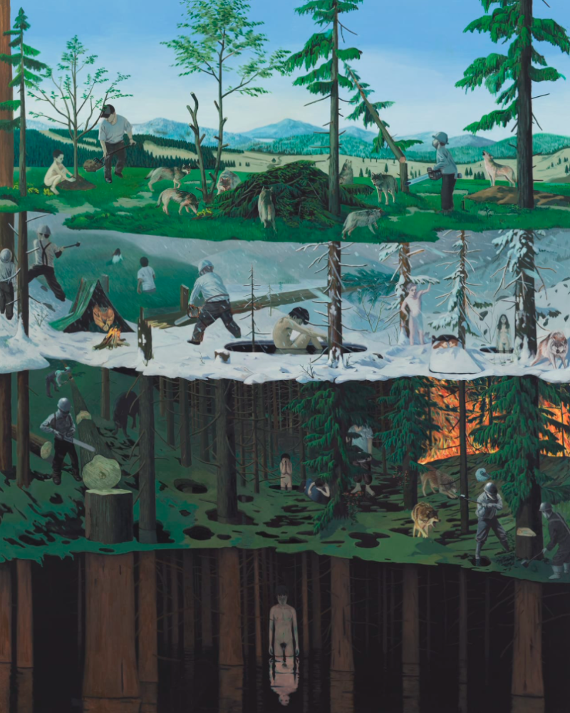 등단 소설가이기도 한 강철규(b.1990)가 작품의 모티브와 서사를 캔버스에 이식하는 과정은 하나의 이야기가 문자라는 체계 안에서 문학 작품으로 정착되는 과정과 유사하다. 회화를 매개로 언어가 가진 묘사의 한계 너머를 전유하게 된 등장인물들과 주변부는 활자화 된 스토리가 줄 수 있는 서사보다 더욱 풍부한 뉘앙스와 미묘한 계층 구도를 형성한다. 총 네 개의 장면이 수직으로 배열된 <관통(Penetration)>(2021)은 계절과 시간의 변화에 따라 숲의 생성과 파괴라는 무거운 주제를 섬세한 필치로 다루고 있는데, 마치 하나의 장편 소설이 압축된 듯 정교하게 배치된 개별 플롯의 상호 작용과 클라이맥스의 고저가 돋보인다.