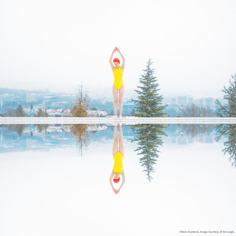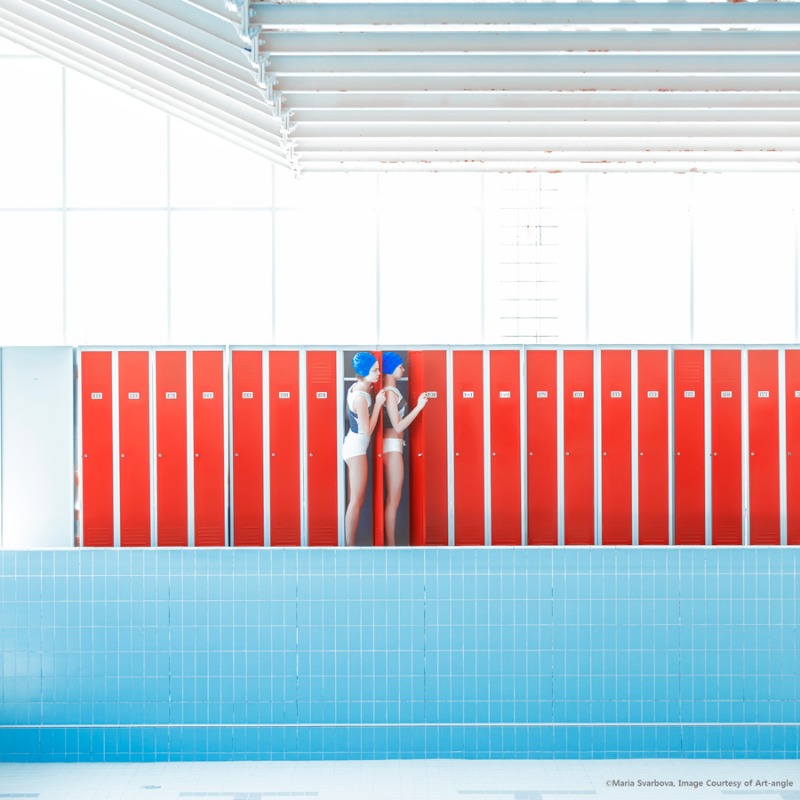반듯한 선으로 이루어진 공간, 투명한 물, 커다란 창으로 들어오는 따스한 햇빛, 컬러풀한 수영복을 입은 모델들 그리고 화면의 모든 요소를 부드럽게 감싸는 파스텔톤의 색채. 이곳은 2018 핫셀블라드 마스터 아트부분 1위 수상자 마리아 스바르보바의 수영장이다. 마치 작품을 위해 창조된 공간인 듯 완벽한 구성과 황금비율의 대칭 구조 그리고 존재의 당위성을 지닌 듯한 오브제들의 배치로 구성된 화면에 작가는 우리를 초대한다. 2014년에 시작하여 현재 진행형 프로젝트인 'Swimming Pool'시리즈 제작을 위해 작가는 슬로바키아 곳곳을 돌며 1930년대에 만들어진 13개의 수영장을 찾아 자신의 공간으로 삼았다. 당시 사회주의를 배경으로 집단 생활을 강조하는 분위기 속에서 수영은 건강을 추구하고, 집단 노동 가운데 개인의 자유로움을 누릴 수 있는 대중들의 여가 생활이었다. 그럼에도 불구하고 경직된 사회적 분위기가 녹아 든 슬로바키아의 수영장은 어딘지 모르게 이질적이고 묘한 긴장감을 불러일으킨다. 시간을 끊임없이 확인하게 만드는 시계, 무균 처리된 듯한 화이트 타일 그리고 '다이빙 금지'(Zakaz skakat), '다이어트 금지(Forbidden diet)', '튜브 금지(No inflatable toys)' 등 행동의 제약을 가하는 타이포그라피는 현대문화의 산물로 여겨지던 수영장에서도 조차 집단주의의 잔재가 남아 있음을 응시하는 작가의 시점을 보여주는 표상들이다. 경고문를 시각화하듯 화면 속의 모델들은 수영장의 곧은 선을 따라 규칙적으로 서 있는가 하면 매뉴얼적인 포즈를 취하고 있다. 장소가 의심될 정도로 고정적인 움직임과 건강하고 아름다운 비율들의 인물은 마치 그리스 시대 석고조각처럼 느껴진다. 그룹으로 모여있음에도 불구하고 동일한 의상과 포즈 그리고 전혀 감정 교류가 없어 보이는 표정 없는 얼굴은 마치 매스게임을 연상시키듯 기계적인 체조 활동과 닮아있다. 이는 그녀가 유년시절을 보냈던 사회주의 공산국, 체코슬로바키아에 대한 기억의 잔재들이다. 5년마다 한 번씩 열리는 '스파르타키아다(Spartakiada)'라 불리는 국가적 규모의 스포츠 행사에서는 체조, 수영 등 다양한 스포츠를 행하였는데 특히나 우아한 움직임을 강조하는 체조는 인기가 많은 종목이었다. 동작의 정확성과 어려운 포즈는 타이트한 유니폼으로 인해 더욱 극대화되어 보여졌는데 유연한 우아함에 내제되어 있는 강박적인 완벽성의 아이러니함은 작품에 깔려있는 지배적인 분위기이다. 이는 모델들의 의상에도 특징적으로 반영되어 있다. 작가는 당시의 감성을 재현할 수 있는 빈티지 의상을 찾기 위해 의상 디자이너 팀과 협업하여 앤틱 마켓에서 신중하게 골랐다. 컬러풀한 수영복과 수영모는 흰 피부와 대비되며 인체의 곡선을 두드러지게 한다. 직선의 공간 안에 곡선을 대변하는 모델의 존재는 자칫 기능을 상실한 과거 건축물에 그칠 수 있는 장소를 생명력 있는 현재의 공간으로 탈바꿈시킨다. 게다가 푸릇한 식물과 창으로 들어오는 따뜻한 햇살은 화면에 응축된 시간을 부여한다. "인물이 없는 공간은 나에게 아무런 의미가 없다"라고 언급한 작가의 말처럼 이미지 속 인물들은 화면을 구성하는 오브제로서 사람과 공간의 관계에서 균형을 이루고자 한 그의 의도를 반영하는 중요 요소라 할 수 있다. 스위밍풀 시리즈의 하부 주제(sub-series)로서 집단 체조를 연상시키는 'Origins', 최대 24만명을 수용할 수 있는 스트라호브 스태디움(Strahove stadium)의 관중석을 배경으로 촬영한 'The Tribune'을 제작할 만큼 작가에게 사람은 중요한 모티브가 된다. 이렇듯 완벽하게 세팅된 공간과 조각같은 사람들로 구성된 완전한 이미지임에도 불구하고 건조하고 차가운 느낌이 아니라 첫눈에 '예쁘다'는 감탄사를 외칠 수 있는 것은 아마도 그녀가 렌즈를 통해 만들어 낸 색 때문일것이다. 전체적으로 파스텔톤의 밝은 색채, 자연채광이 내려앉은 푸른 물 그리고 오브제들에 입혀진 원색의 강렬한 대비는 미니멀하면서도 초현실적 분위기가 감도는 동시대적인 이미지로 구현된다. 여기에 오래된 건물만이 줄 수 있는 레트로 감성이 더해져 시대를 관통하는 보편적인 아름다운 장면(scene)이 만들어지는 것이다. 이 아름다움에 매료된 우리를 작가는 적극적으로 화면 안으로 이끈다. "비어 있는 공간에 사람들 개개인의 의미 있는 감정이 가득 채워졌으면 좋겠다."는 언급처럼 작가는 우리를 그저 수동적인 관객으로 보는 것이 아니라 작품을 완성하는 마지막 조각(piece)으로서 초대에 응해주길 바란다. 그렇다면 우리는 이미지 앞에 서서 충만한 감정과 깊은 응시로 푸른 물의 정적을 깨뜨릴 준비가 되었는가. 이번 전시는 국내에서 여는 마리아 스바르보바의 첫 개인전으로 5월 31일부터 6월 30일까지 롯데갤러리 잠실점에서 선보인 뒤, 약 20여점의 작품이 추가되어 8월 2일부터 8월 25일까지 롯데갤러리 인천터미널 점에서 계속된다. ■ 롯데갤러리