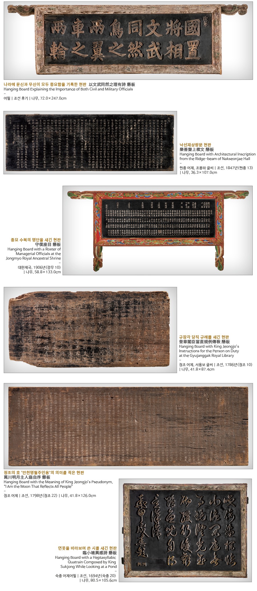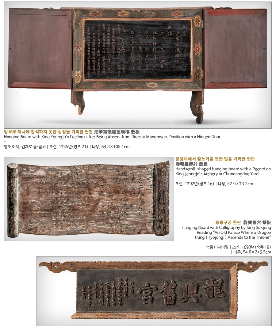 궁궐을 포함한 옛 건축물의 처마 아래에는 현판이 걸려 있습니다. 현판에는 건축물의 이름이 새겨져 있어 해당 건축물의 기능과 용도를 알려줍니다. 건축물에 이름을 지어 현판을 거는 것은 건축물이 지닌 의미를 밝히고 건축물에 생명력을 불어넣는 일입니다. 현판은 삼국시대부터 사용된 것으로 보이며 조선시대에 널리 사용되었습니다. 궁궐을 비롯해 종묘, 왕릉 등 조선 왕실 관련 건물에 걸린 현판에는 조선이 지향한 유교적 이상 사회의 모습이 빼곡히 채워져 있습니다. 해당 건물의 성격과 건립 목적에 어울리는 글귀와 좋은 뜻을 담아 함축적으로 표현하였습니다. 궁중 현판은 분야별 최고의 장인이 참여해 완성했습니다. 현판의 색상, 글씨, 무늬 등에는 제작 당시의 시대적인 미감이 반영되어 있습니다. 조선 왕조 궁중 현판은 2018년 ‘유네스코 세계기록유산 아시아태평양 지역목록’에 등재되어 오늘날에 이르고 있습니다. 이 전시에서는 조선 왕실이 궁중 현판을 통해 널리 내걸고자 했던 유교적 이상과 가치를 살펴보고자 합니다. 우리 조상이 궁중 현판을 우러러보며 마음속에 되새겼을 이상 정치의 참뜻을 함께 새겨보는 기회가 되기를 바랍니다. (출처 = 고궁박물관)