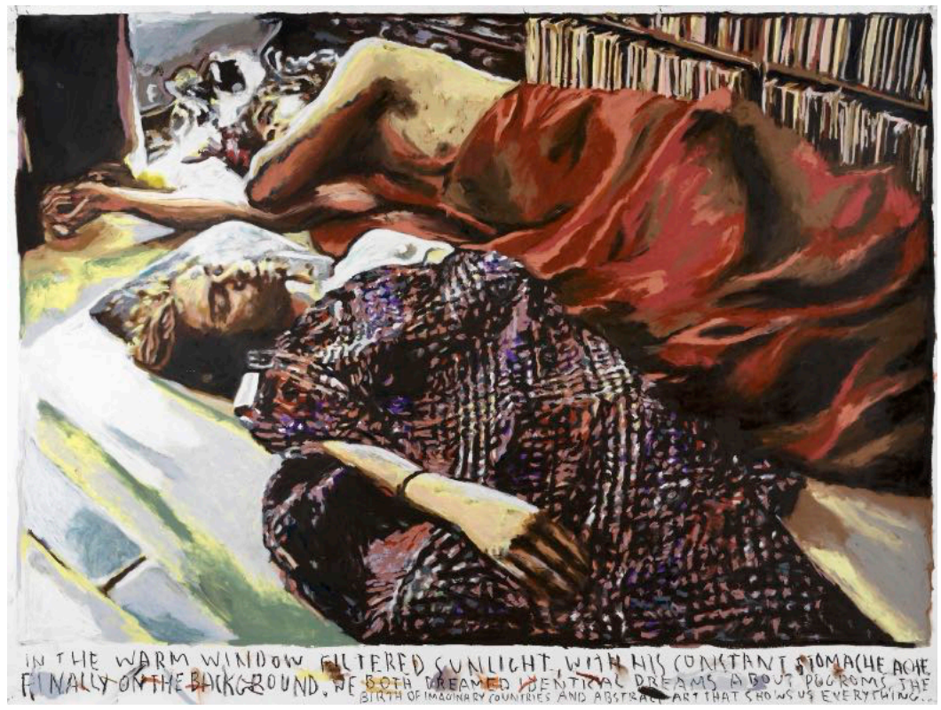 갤러리바톤은 리너스 반 데 벨데(Rinus Van de Velde, b. 1983)의 두 번째 개인전을 10월 5일부터 11월 5일까지 개최한다. 평단과 미술 애호가들의 호평 가운데 올봄 유럽의 대형 미술관인 보자르(BOZAR)에서의 성공적인 개인전을 마친 작가는, 새로운 매체인 오일 파스텔 드로잉과 팬데믹 기간 중 제작된 신작 비디오 〈La Ruta Natural〉(2019–21)을 통해 가상과 실제, 평행우주 안의 무한한 개연성이라는 오랜 관심사에 보다 깊숙이 다가간다. 우리가 이미지를 너무 쉽게 믿는다는 리너스의 일침은 그의 작업 세계를 이해하는 키워드이기도 하다. 영상 작업 시 종종 간단한 촬영 트릭이 최종 결과물에서 그럴듯하게 보일 때마다 놀란다는 그의 부연에는 실제와 허구의 간극이 생각보다 깊지 않고 느슨한 경계를 공유한다는 점을 전제로 한다. 차콜 페인팅 시리즈 때부터 고수한 ‘상부의 이미지와 하단의 단문 조합’은 한 이미지가 특정 이벤트의 서술적 관계일 때 신문 또는 저작 등에서 광범위하게 사용돼온 레이아웃이다. 텔레비전이 보도 매체의 주류로 자리 잡은 이후에도 CNN 등의 실시간 속보 등을 통해 무비판적으로 수용돼온 이 포맷은, 그의 작업에 차용되어 창작의 결과물을 실체적 사건과 혼동하게 만드는 일종의 트로이 목마처럼 기능한다. 어느덧 온 인류가 세상을 보는 창이 되어버린 인스타그램도 동일한 포맷으로 매일 수억 건의 이미지와 단문을 실어 나른다. 우리가 남에게 보여주고 싶은 이미지, 즉 타자가 나의 삶을 욕망하게 만드는 이미지들은 어떤 면에서 리너스가 얘기하고 있는 평행우주의 원리와 닮아있다. 삶의 아주 찰나에 불과한 사진들은 누군가의 삶을 온전히 투영하고 있지 않지만, 평행우주의 어디선가는 그러한 삶이 일상인 또 다른 그가 존재할지도 모른다는 가설 말이다. 작가의 첫 전시에서 선보인 6미터 폭의 대형 차콜 페인팅 〈Most of the time during the day…〉(2018)은 트레이딩룸에서 분석에 몰두하고 있는 작가와 흡사한 용모의 인물을 묘사한 대작이다. 그런데, 데이트레이딩을 통해 밤에 행해지는 미술 작업에 필요한 돈을 마련한다는 문장이 하단에 위치하면서, 작가의 말투와 훤칠한 용모를 아는 사람들에게는 혼동스러운 메시지 또한 선사한다. 작가는 비록 텍스트가 작품의 거의 모두를 잠식한 이미지에 비해 쉽사리 눈길을 이끌지 못함에도 그것이 지닌 잠재력을 간파하고 있다. ‘나는 절박하다(I’m Desperate)’라는 쓰인 종이를 들고 웃고 있는 젊은 비즈니스맨의 사진에서 질리안 웨어링(Gillian Wearing, b. 1963)이 언캐니한 괴리와 긴장감을 끄집어냈다면, 리너스의 문장은 이미지를 넌지시 부연하면서 관조적으로 툭 내던지는 독백과도 같다. 대부분 일인칭으로 시작하는 문장은 무엇엔가 열중하고 있는 인물이나 원경으로 묘사된 풍경과 결합하여, 마치 작가의 자전적 경험의 산물인 듯한 분위기를 풍긴다. 특히, 이번 오일 파스텔 드로잉 신작에서는 텍스트 위로 산발적이고 현란한 색의 도포가 부분적으로 전개되어, 이미지와 텍스트 간 경계를 보다 느슨하게 함과 동시에 필연적인 가독성의 저하가 불러오는 신비감을 배가시킨다. (제공 = 갤러리 바톤)