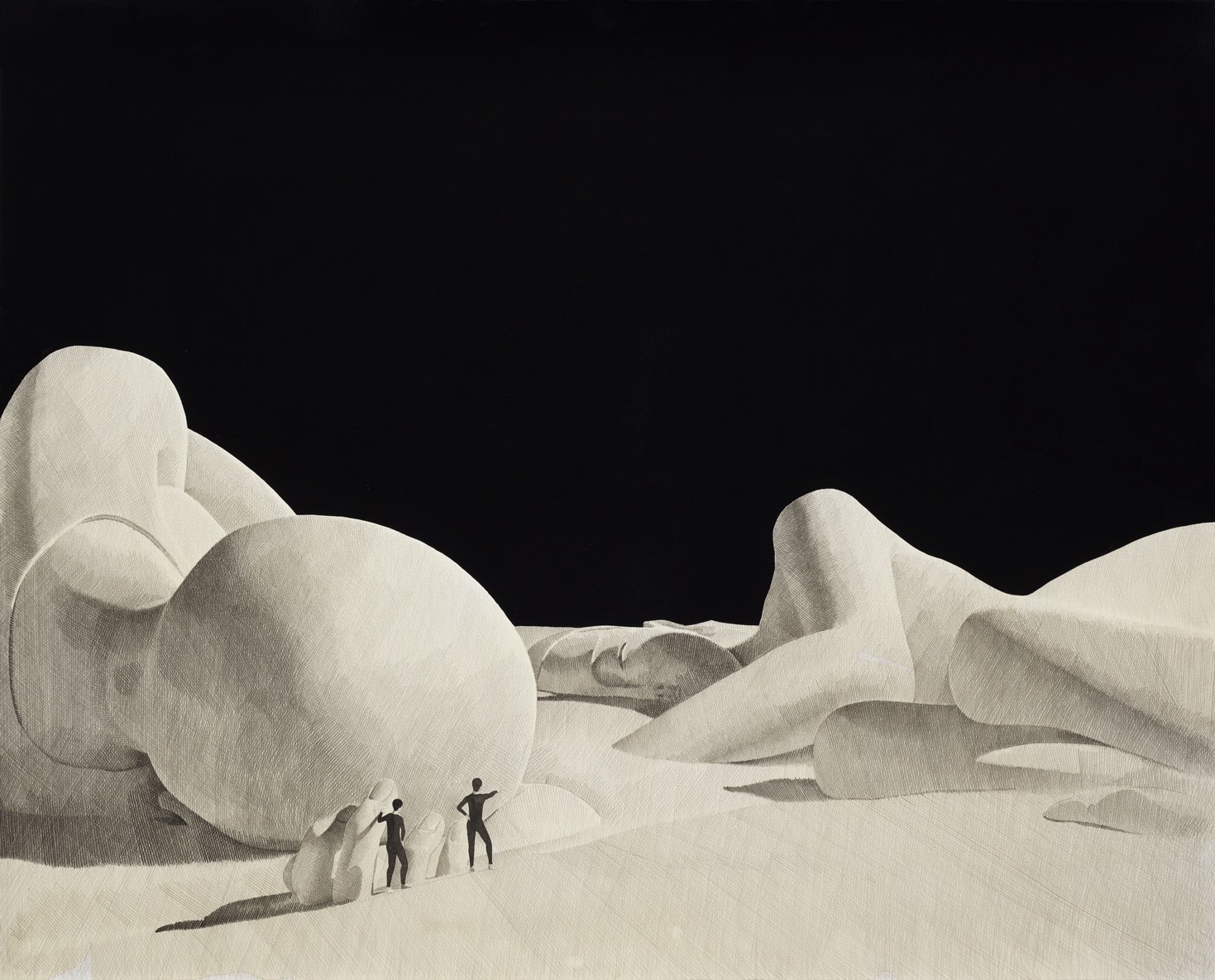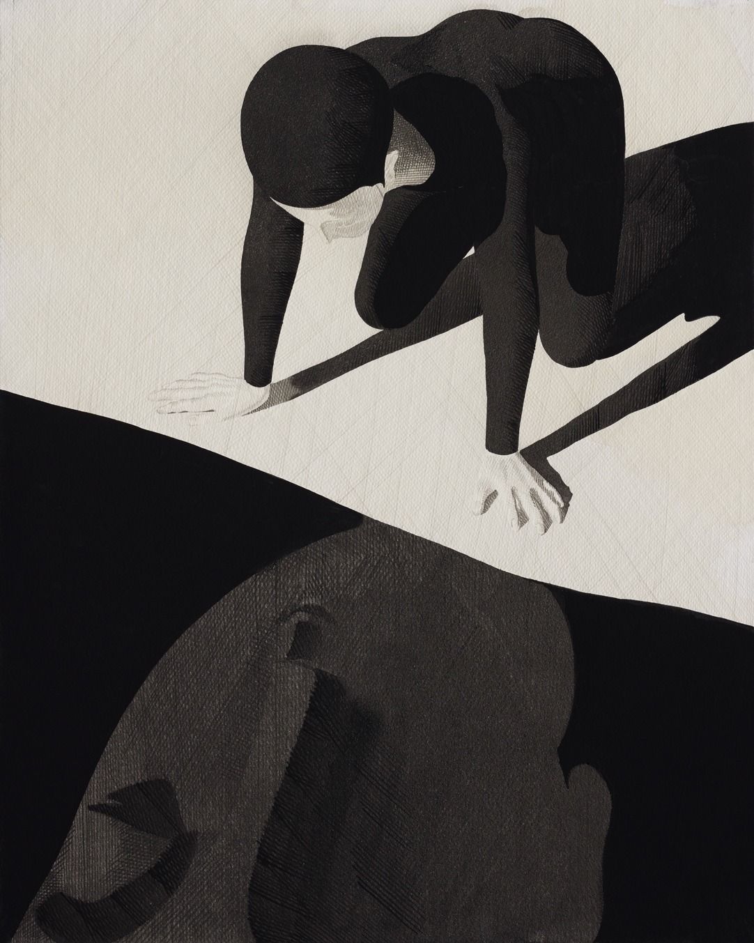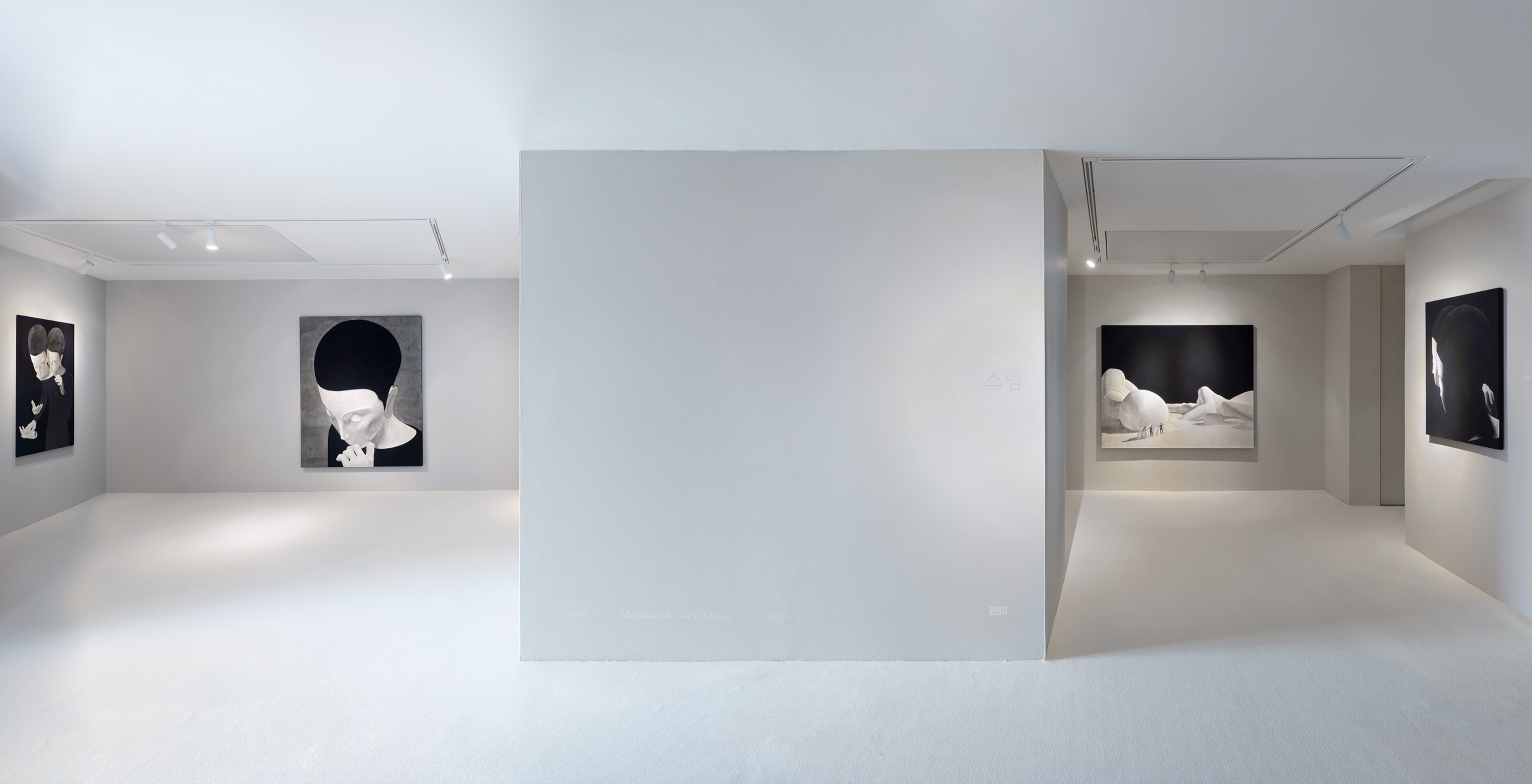 Everydaymooonday presents Moonassi’s second solo exhibition from October 22nd to December 4th. In his first solo exhibition at EM gallery, Daehyun Kim portrayed the ambiguity of relationships exploring the complexity of the inner self with minimal color palettes and style. For this exhibition , he takes the next step from exploring the ambiguous borders between the self and others to further depict the immersive experiences we have with each other's presence and time. Encounter The moment you are imbued in the scent, color, time and presence of others, everything in the past no longer exists. Seeping into another’s presence and allowing yourself to depart from the self is the inert empathetic passion to assimilate with others. The concept of self you are intertwined with disperses and opens up a new world in a state of selflessness, welcoming others. Smim Greeting others by breaking away from the intrinsic self is the sublime will to embrace the inner resistance in this struggle. This is the silent trust we have among us in the journey of life we have together. This may feel reckless but not futile. Universe Each individual’s time intersects and shares multiple colored lights. These lights are more abundant and beautiful than anything you’ve felt, and the moment it becomes meaningful to each other the world becomes their own. This is a world away from futility where even adversity becomes happiness. This is jouissance! In this exhibition, moona reaches out to another moona to be together and console each other. It is not about hoping for your body and mind to become one with me, but rather to lean on each other in treasuring togetherness despite the many differences we have. In his works, you feel the dichotomies of ‘joy and weariness’ of the pure white space in the negative space and the ‘confusion within silence’ in the pitch dark space. The countless strokes in all of these contradictions are the stories of our lives. Like the vast amount of strokes, we constantly discover each other. These discoveries shape into a voluminous shape building ‘our lives’ or ‘smim’ of each other. Daye Shin Everyday Mooonday (Source = everydaymoonday)