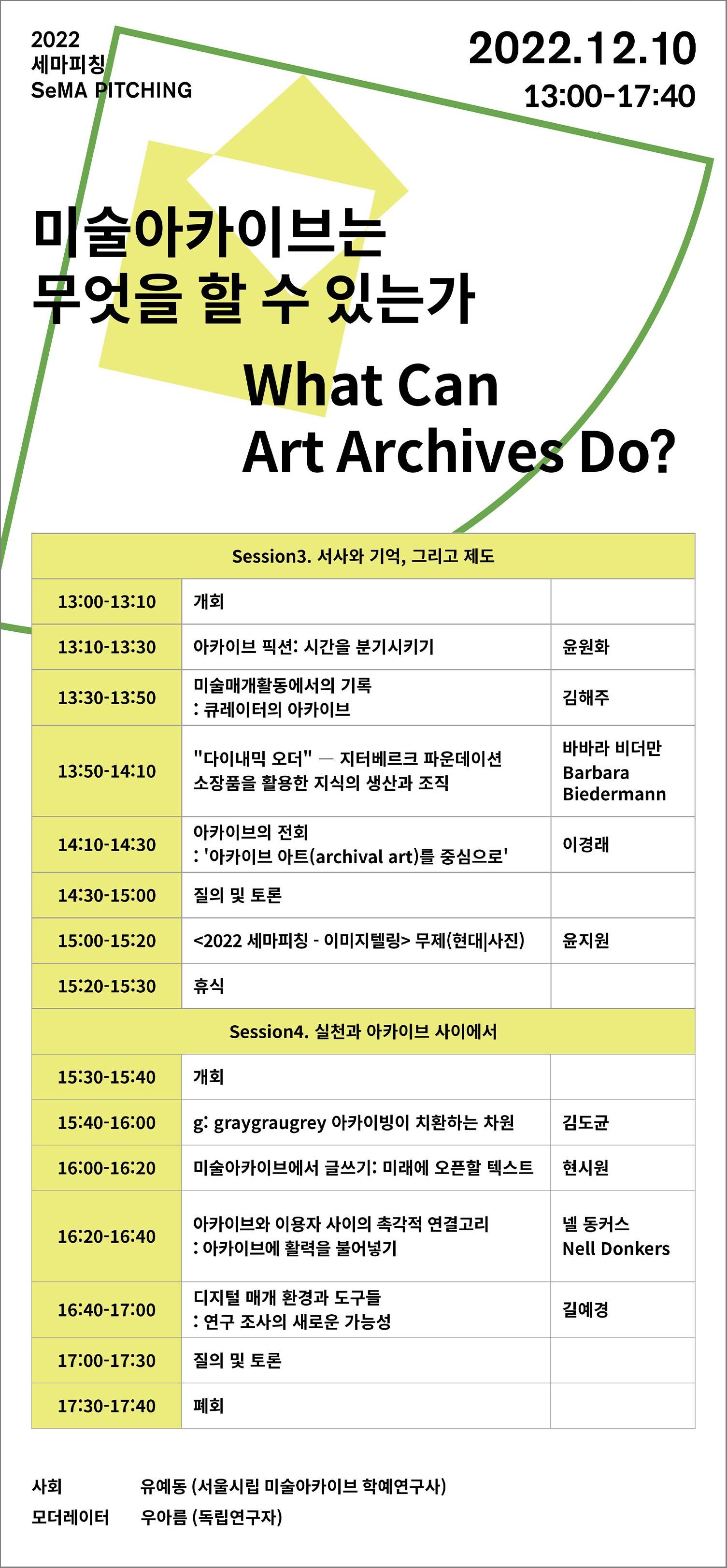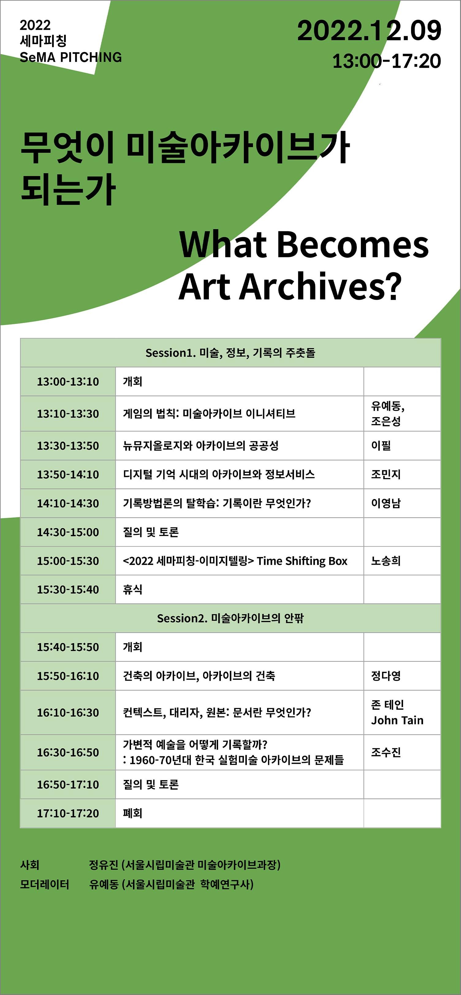 장소 : 서울시립 미술아카이브 나눔동 2F 다목적홀 연구포럼 참가 신청 링크 : https://bit.ly/2022SeMA_PITCHING 신청 마감 2022. 12. 2. 오후 6시 *심포지엄은 양일 유튜브 라이브로 생중계 됩니다. - 서울시립미술관은 은 미술아카이브의 실천과 운영을 다각도로 모색해 보는 연구포럼, 2022 세마피칭 <기록하는 미술관, 기억하는 미래>를 개최합니다. ‘2022 세마피칭’은 아카이브와 동시대 미술을 잇는 국내외 현장 전문가들을 한자리에 초청해 미술아카이브 실천의 새로운 방향을 함께 모색해보는 연구 포럼입니다. 서울시립 미술아카이브는 개관에 앞서 2022년 여름에 진행한 ‘세마피칭 파일럿’에서부터 다각적인 실천을 탐색해 왔으며, 본 연구포럼을 통해 발견한 관점들을 2023년 미술관 개관 이후의 실천과 의제 발굴까지 이어가 봅니다. 2022 세마피칭은 기록을 수집, 보존, 연구하는 미술아카이브 활동이 현재에도 그 방법과 범위를 갱신하는 현재진행형 실천임을 기억하며, 그 변화를 통해 미술 아카이브로부터 확장될 수 있는 연구, 조사, 창작, 비평의 가능성을 가늠해 봅니다. 연구포럼의 첫째 날은 ‘무엇이 미술아카이브가 되는가’라는 주제 아래 미술 아카이브가 구성되어온 궤적을 되짚어봅니다. 기록학과 동시대 미술아카이브의 이슈를 교차해보며 의제를 발굴하고, 미술아카이브의 경계선을 현재 시선으로 가늠해봅니다. 둘째날은 ‘미술아카이브는 무엇을 할 수 있는가’라는 주제 아래 미술아카이브를 통해 어떠한 텍스트가 새로 짜일 수 있을지를 상상해보며, 이를 위한 연구, 조사, 글쓰기, 창작의 새로운 방법들을 공유하면서 미술관의 수행적 탐색을 펼쳐봅니다. 2022세마피칭은 작가, 비평가, 큐레이터, 연구자, 매개자 등 다양한 위치에 있는 행위자들과 함께합니다. 각자의아이디어가 새로운 실천으로 발휘될 수 있도록 현장 지향형 피칭을 지향합니다. 미술 기록물의 분류와 보관을 너머, 기록물이 다시 꺼내어져 현재의 이야기로 쓰이는 방법들을 조망합니다. 특히 본 연구포럼에서는 노송희, 윤지원 작가가 서울시립 미술아카이브의 기록물을 창작자의 관점에서 재해석한 영상 작품을 프리미어 상영합니다. 두 작가가 미술관의 자료를 살펴보며 작품을 구성한 과정은 세마피칭 파일럿 프로그램을 통해 확인할 수 있습니다. 주최 : 서울시립미술관 기획 : 서울시립 미술아카이브 유예동 학예연구사, 이다영 학예연구원 협력기획 : B파운데이션, 권주희, 우아름, 임다울, 최정윤, 호경윤 디자인 : 조은지스튜디오 공간조성 : 이수성 번역 : 김효정, 문유진, 콜린 모엣, 아트앤텍스트 동시통역 : 이기은, 조수지 문자통역 : 에이유디사회적협동조합 영상제작 : 프로덕션이은정 촬영 CJYART STUDIO 조준용 (출처 = 서울시립 미술아카이브)