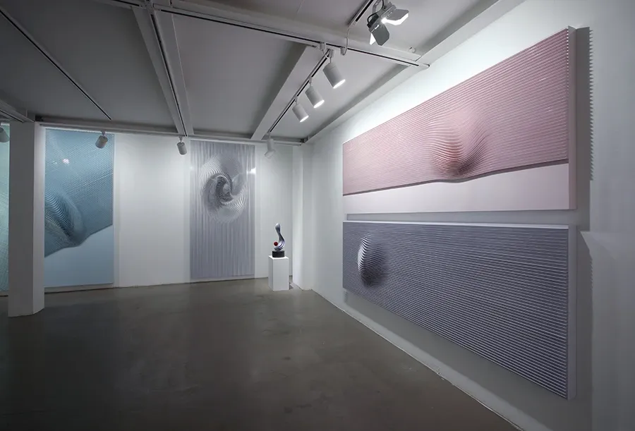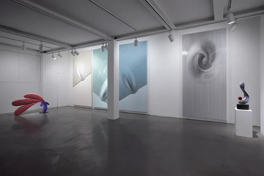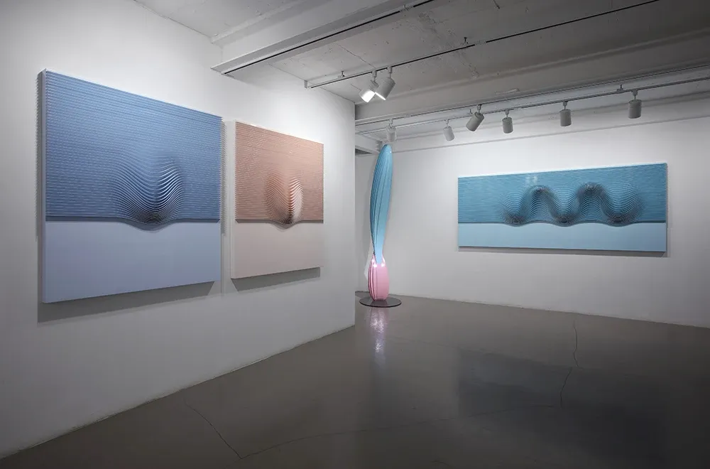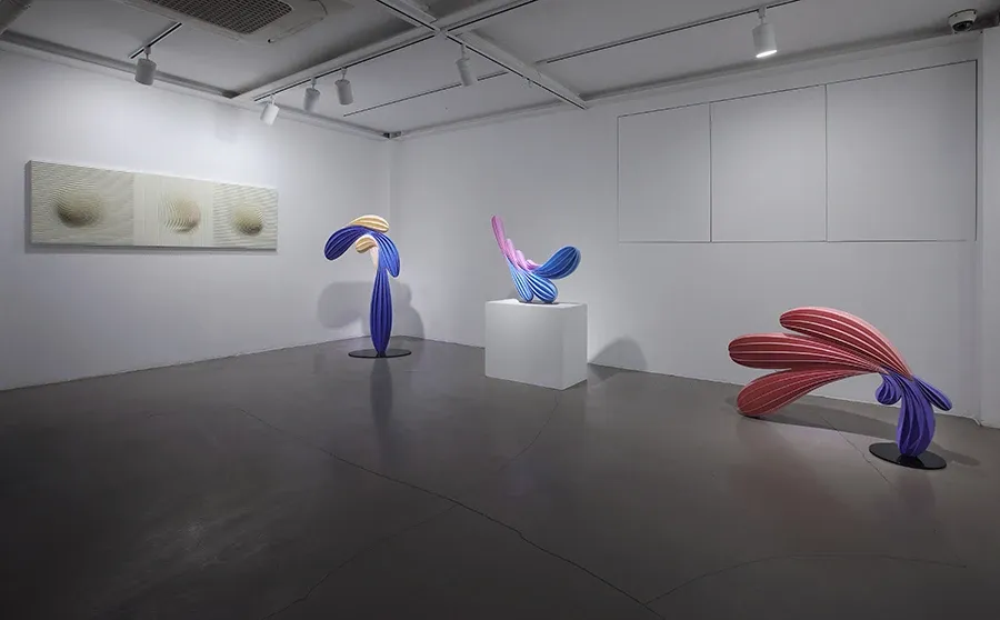 싹, 열매, 꽃, 나무, 풀, 물방울 등 자연 요소들을 연상시키는 김태수의 조각은 자연이 가지고 있는 유기적 형태의 아름다움을 조형적으로 포착해 레진, 용접, 스테인리스 스틸 등의 재료로 작품화 및 구축된다. 철판을 기하학적 형태로 잘라 용접한 후 분채 도장을 거쳐 탄생한 조각들은 경쾌하면서도 압도적인 에너지를 내뿜는다. 뿐만 아니라 기하와 구상, 자연적 재료와 비생물적 물질 그리고 이성적 형태와 자연의 상기(想起)라는 상반되면서도 필연적인 관계성이 드러나면서 아이러니한 조화로움이 풍긴다. 김태수의 작업은 외형적으로 채색된 판재가 겹겹이 중첩된 추상 형태를 띠고 있지만, 조각이 지닌 생명력과 유연한 리듬감은 관람객들에게 인간과 자연을 아우르는 생태 현상의 가늠할 수 없는 크기와 깊이감, 에너지, 시적인 감흥을 전달하고 보편적인 공감을 이끌어낸다는 점에서 관념적인 차원을 넘어선다. 나아가 굴곡, 그림자와 같은 물성을 지닌 작품들은 관람객들의 동선과 시선이 이동함에 따라 형태와 지각이 시시각각 변화하면서 일상 속에서 즐거움과 유희를 경험할 수 있게끔 유도한다. 《Nature’s Secret》은 ‘깊은 생명력이 바로 자연이 지닌 비밀’이라는 관념을 주제로, 작가가2009년부터 작업해온 <ECO FLOW>시리즈 보다 한 단계 더 근원적, 근본적인 접근이다. 이번에 선보이는 대형 부조 작품 중 <Calm and Passion>과 <Breeze in the Forest>, 이 두 점을 눈여겨볼 필요가 있다. 특히 회오리처럼 빨려 들어갈 것만 같이 일렁이는 <Breeze in the Forest>는 자연의 무한한 생명력을 표현하기 위해 곡선의 조형 스타일을 더 촘촘하고 세밀하게 중첩했다. 또한 기존의 강렬한 보색 대비보다 옅고 부드러운 색을 사용해 생성된 은은한 깊이감은 마치 자연의 포용력과 온화함을 표현하는 듯하다. 앞서 소개된 메인 작품을 기반으로 《Nature’s Secret》의 모든 작품들이 파생되었으며, 이전 작품들 보다 더욱 몰입감 있게 무한한 자연의 신비와 거대한 힘을 느낄 수 있다. 김태수는 이번 전시를 통해 자연 형태의 아름다움을 담는 것에서 나아가 우리 삶이 본질적으로 자연의 생명력을 토대로 한다는 메시지를 전달한다. (출처 = 표갤러리)