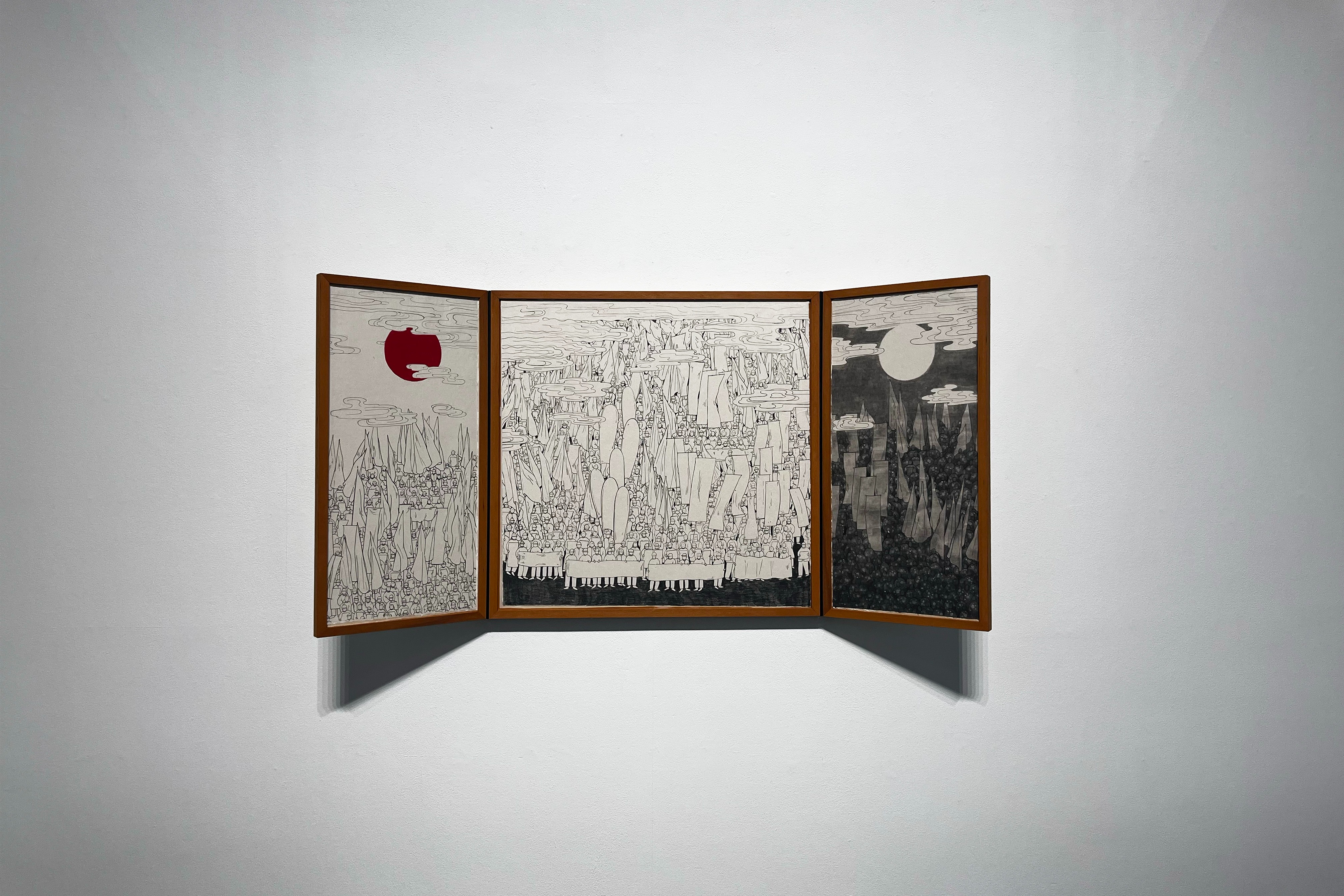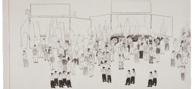• 			김소정은 사물의 온전한 형태만을 그릴 뿐, 그것의 본질은 설명하지 않는다. 집결한 군중을 그리지만 표정은 그리지 않고, 그들이 쥐고 있는 깃발과 현수막은 그리되 외침과 주장은 비운다. 그의 헌신적인 먹 선은 구체적인 현실로 향하지 않는다.