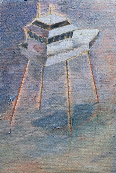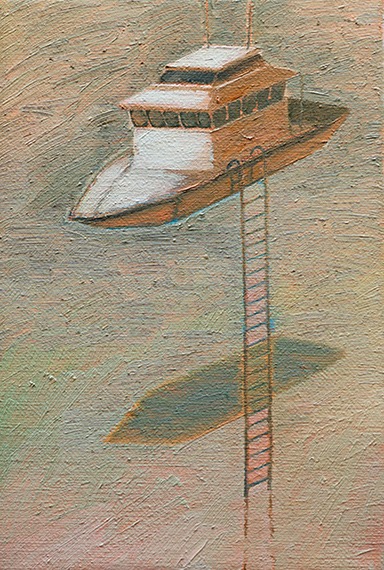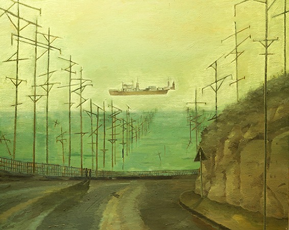 첫 개인전에 비견해 뚜렷한 차이를 가진 것은 시선의 위치다. <떠도는 새와 개의 방>의 지배적인 인상인 창밖의 연쇄(우연하나 필연 되고야 마는)에서 벗어나 부유와 정박의 줄다리기를 시도한다. 내부에서 외부로 향하던 시선이 외부에 위치하여 외부를 마주하며 능동적으로 대립의 순간을 조망한다. 이는 김민조가 목격한 배를 배의 자리로, 비행기를 비행기의 자리로 의미하게 만드는 비약의 발판이다. 시간을 붙잡아 둔 중력이라는 닻은 끈질긴 붓질로 사슬이 거두어진다. 한 폭에 담긴 대상들은 고유함을 잃지 않고 동등하게 대립하며 긴장을 유지한다. 가늘고 위태로운 선을 통해 포착되고 마주할 수 있는 대립은 그로 인해 상호적인 상태 유지를 반증한다.