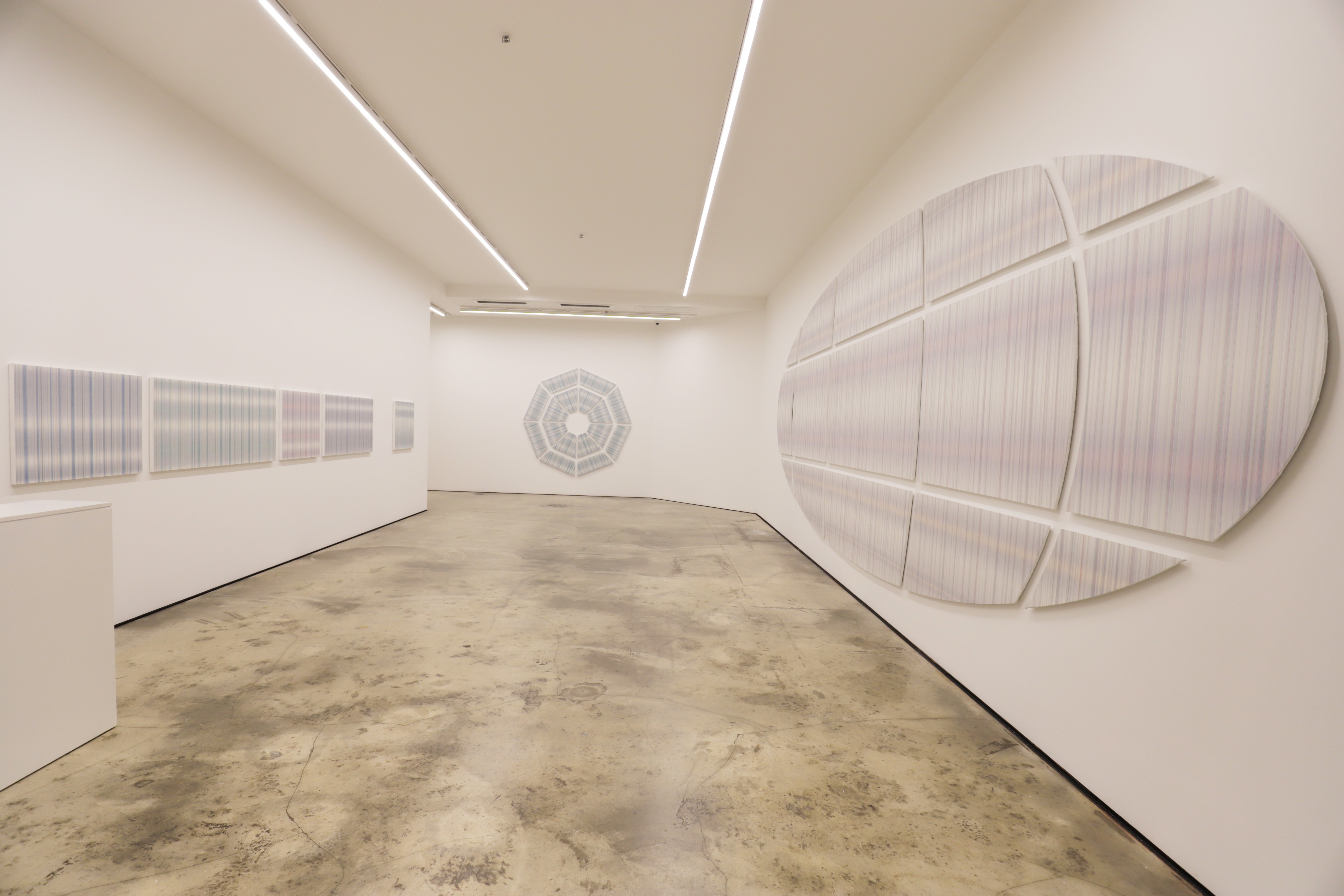 이번 전시에서 그의 가상은 시각적이라기보다 신체적인 것, 혹은 정동적인 것이 됐다. [...] 우리는 그의 작업에서 우리 자신의 신체가 그림의 파동적 장에 직접 영향을 받는 것처럼 느끼고, 동시에 어떤 공명이 일어나고 있음을 느낀다. [...] 그 가상은 그래서 신체적 가상이다. 제한적 눈이 아니라, 우리의 몸이 관여하고, 몸으로 체험되는 가상이다. 우리는 그림 앞에서 마치 바다에 뛰어들 듯, 반대로 말해 바다가 우리를 감싸 안듯 그림의 출렁거림에 몸을 맡길 수 있다. 그렇게 파동과 공명하는 순간 그림과 우리와의 경계는 사라지고, 나와 그림에서 안-사이(in-between)가 발생하며, 곧 정동을 활성화한다. 그의 작업이 언제나 반복의 수행성과 분리되지 않는 덕에, 거기엔 항상 그가 있었다. 반복의 리듬은 그의 눈과 신체의 운동 범위 안에서 그 자신의 정신적, 신체적 리듬에서 출현한다. 그는 자신의 리듬을 그림에 체화하는데 만족하지 않고, 관객마저 하나의 전일적 세계로 끌어들이려 한다. 그의 작업은 그의 신체적 수행에서 시작되어 관객이 작품과 공명하면서 완성된다.