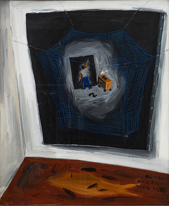 회화의 이름_그림의 시작 조정란(누크갤러리 디렉터) ‘회화란 무엇인가?’ 이 질문은 그림을 그리는 모든 이들에게 끝없는 사색과 탐색을 이끌어낸다. 회화는 오랜 시간 각자의 생각과 방식으로 다양하게 변화해 왔다. 회화의 영역이 넓어져 이제는 가상의 공간으로 확장되고 있는 현실 앞에서 우리는 회화란 무엇인가에 대한 가장 기본적인 질문으로 되돌아간다. 이번 전시는 2022 년 노충현, 샌정의 <회화의 이름>에 이어지는 전시로 제목은 작가 노충현의 제안으로 움베르토 에코의 소설 <장미의 이름>에서 따왔다. 소설 말미에 언급된 한 구절은 “지난날의 장미는 이제 그 이름뿐, 우리에게 남은 것은 그 덧없는 이름뿐.” 회화 또한 덧없이 남아있는 이름 뿐이 아닐까? 라는 질문을 던지며 본 전시를 중견 회화 작가의 2 인전으로 이어가려한다. 1990 년대 최진욱은 좋은 작가가 되리라는 확신을 가지고 <그림의 시작>이란 제목 아래 거침없이 그림을 그렸다. 확장된 담론 속에서 회화의 개념이 단순 명쾌하게 정의되고 문제해결이 명확했던 그 시절의 작가는 세상을 살아오면서 신념이 점점 옅어지고 확신이 사라져가고 있음을 깨닫는다. 한 평론가의 말처럼 그림의 시작은 그림의 끝이 아닌가! 끝이 아니었나! 하는 의심을 가지고 <회화의 종말>을 그리기도 했던 최진욱은 무심한 듯 체험적으로 붓을 움직여 지속적으로 그림을 그리고 있다. 그의 그림은 조형성을 염두에 두지 않고 자유로운 붓질로 나아가지만 사실성에서 멀어지지 않으며 형상을 따라간다. 이번 전시에서 보여주는 작품들은 그에게 가장 익숙한 공간인 작업실 풍경이다. 1990 년의 자화상인 작업실 풍경 <그림의 시작>과 함께 1995 년의 자화상, 그리고 현재의 자화상인 작업실 풍경으로 이어진다. 그는 작업실 공간 속 거울에 비친 자신의 모습을 여러 해에 걸쳐 반복해서 그려왔다. 자신의 세계는 방안 작업실 공간이 전부인 듯, 그 안에 세상의 모든 사건 사고를 가져다 거울 앞에 쌓아 놓는다. 최진욱은 세상을 직면하기보다는 거울에 비춰진 자신의 모습을 통해 자신을 들여다보고 세상을 바라보며 끊임없이 회화란 무엇인가에 대한 질문을 던진다. 김지원은 1990 년대 <그림의 시작-구석에서>, <무거운 그림의 시작> 연작을 그렸다. 작업실 구석에서 시작해서 새로이 나아가겠다는 작가의 다짐은 그림의 제목에서부터 표출되고 있다. 그는 <그림의 시작구석에서>그림 안 모서리 공간 속에 평면의 그림을 그려 넣고 공간과 평면 그리고 회화에 대한 질문을 던진다. 김지원은 그림을 통해 혁명을 이루고 세상을 바꾸고 싶다고 한다. 긴 시간 그림을 그려오면서 혁명도 없고 아무런 발언도 없을 수 있지만 세상을 바꾸고 싶다는 바램으로 오늘도 그는 작업실 캔버스 앞에 서있다. 이번 전시에서 김지원은 90 년대 초반의 그림들과 함께 자신의 대표작인 <맨드라미>를 시대별로 한두 점씩 보여준다. 그의 초기 그림에는 사회문제와 그에 대한 해학이 담겨있으며 좀 더 대상에 충실하게 그려졌음을 볼 수 있다. 한 시기에 병행해서 그리고 있는 다양한 주제 중의 하나인 맨드라미에서는 시기별로 그리는 방식의 변화와 함께 계절에 따른 색의 변화를 볼 수 있다. 한여름 태양아래 타오르는 붉은 맨드라미가 있다면 가을의 시들어 퇴색한 갈색의 맨드라미가 있다. 겨울밤 눈 내린 맨드라미 밭에서는 검은 빛의 웅장한 오케스트라 교향곡을 들을 수 있다. 한 공간에서 두 작가의 다른 방식의 그림을 보면 그 다름에서 오는 경이로움을 경험할 수 있다. 최진욱은 원색에 가까운 색상으로 겹쳐지지 않은 빠르고 대담한 붓터치로 미끄러지듯 작업실 풍경을 사실적으로 그린다. 반복적으로 보이지만 각 그림에 담겨진 변주는 보는 이의 호기심을 자극한다. 김지원은 물감을 쌓고 뿌리고 긁어내는 행위가 그대로 보이는 두터운 캔버스에 대상의 부분을 강조해서 드러낸다. 구상과 추상을 오가는 그림에서는 거리를 두고 멀리서 바라보면 형상을 인지할 수 있지만 가까이 다가가면 형체는 사라지고 단지 물감의 층위 만을 대면하게 된다. 작가는 자신이 보고 기억하는 것을 각자의 방식으로 그리고 관객은 자신의 관점으로 그림을 보고 느낀다. 화가는 회화의 위기를 직면하기도 하지만 그림을 통해 사유하고 자신의 존재를 이어나간다. 회화의 이름은 단지 그 이름만 남아있는 것일까? (출처 = 누크갤러리)