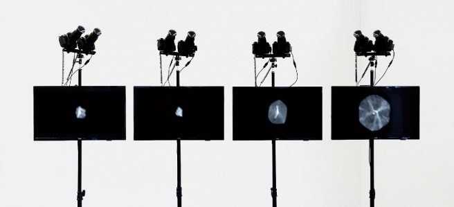 [Viewers’ Conditions] 익숙한 기계 장치들이 의인화된 형상으로 존재감을 드러내며 우뚝 서있다. 자세히 들여다보니, 카메라 렌즈 앞에 볼록한 형태의 필터가 시선을 사로잡는다. 이 생소한 물체가 이윤재 작업의 중요한 단서이다. 사물의 본질에 대한 탐색을 넘어 인간의 고정적 인식에 의문을 제기하는 이윤재는 ‘보는’ 행위에서 발생하는 시각적 차이를 다양한 매체로 풀어낸다. 4명의 각막을 본뜬 필터를 활용하여 만들어진 이미지들이 전시장을 점유한다. 같은 곳, 같은 대상을 바라보지만 화면 위에서 서로 다른 크기와 형태로 저마다의 시야를 드러낸다. 보는 것도, 각자가 처한 조건도 다르다. 작가의 집요한 탐구는 끝없는 질문의 답을 찾아가는 과정이다. 객관적인 데이터는 주관적 필터를 거치며 타인이 바라보는 세상을 엿보게 한다. 감각하는 방식의 새로운 지평이 열린다. 이제야 비로소 ‘본다’의 진짜 의미에 좀 더 가까이 다가선 듯하다. 백소현(OCI미술관 큐레이터) - [당신이 보는 것이 내가 보는 것과 같나요?] 만약 누군가가 당신에게 이렇게 묻는다고 상상해 보자. “당신이 보는 것이 내가 보는 것과 같은가요?” 어떤 이는 대체 무슨 황당한 소리를 하나 웃어넘길 것이고, 또 다른 이는 저 사람이 색맹이나 색약 증세가 있는 걸까 의아해할지도 모른다. 하지만 만약 저 질문이 철학적이거나 의학적인 질문이라면 답하기란 그리 쉽지 않을 것이다. 이윤재의 작업을 잘 보기 위해 한번 저 질문에 진지하게 응해 보자. 우선 가장 원론적인 수준에서 말하자면 답은 망막과 시상, 시각피질에서 활성화되는 일련의 세포들 사이의 유사함의 정도와 전두엽에서 빛에 의해 활성화되는 기억이 얼마나 비슷한지에 달려 있다.1) 당신과 나의 삶의 경험이 같을 수는 없으므로 기억이 자극하는 신경세포의 강도 문제는 잊기로 하자. 남은 것은 생리학적 문제다. 당신과 나는 유전자가 다르므로 세포의 양상이 동일할 수는 없기에 내게 보이는 것과 당신에게 보이는 것이 완전히 같을 수는 없을 것이다. 하지만 당신이 나와 같은 방식으로 보고 있는가라고 묻는다면 얘기가 또 달라진다. 인간의 눈은 간상체(rods)와 추상체(cones)라는 두 종류의 광수용기를 가지고 있고, 대부분의 사람들은 장파장 추상체(적 추상체), 중파장 추상체(녹 추상체), 단파장 추상체(청 추상체)의 세 종류의 추상체를 지닌다.2) 간혹 추상체에 결손이나 변형이 있는 경우 색을 다르게 보게 된다. 이 경우 신체 기관의 기능에 따라 긍정과 부정이 갈릴 것이다. 다소 초점이 달라지지만 질문을 조금만 더 밀고 나가보자. 그렇다면 내가 보는 것은 언제나 동일한가? 같은 조명 조건의 동일한 회색도 주변의 휘도가 어떠한가에 따라 더 밝게도 보이고 더 어둡게도 보인다. 결국 이 긴 자문자답이 향하는 곳은 본다는 것이 얼마나 복잡하고 다양한지, 일관되고 동일한 보기를 가정하는 것이 얼마나 어불성설인지다. 이윤재의 <광학 사중주>(2023)는 비슷한 문제의식에서 출발한다. 작업의 계기는 몇 년 전 제작한 (2021)로 거슬러 올라간다. 난시와 근시가 있는 작가에게 주변 사람들은 줄기차게 라식 수술을 권했는데, 맨눈으로 볼 때 흐릿하고 번지게 보이는 풍경을 좋아했던 작가는 이런 권유가 늘 편치 않았다. 어느 날 버스에서 안경을 벗었을 때 안개가 낀 듯 불빛이 번진 야경을 보고, 작가는 새로운 세계를 발견한 듯 스펙터클한 낯선 풍경에 매료되었다.3) 초점이 맞지 않은 풍경의 추상적 아름다움을 보여주고 싶었던 작가는 자신의 각막의 형태를 본뜬 카메라 필터를 제작하여 그것으로 맨눈으로 보이는 야경을 재현했다. (2020~)은 이를 위해 조사한 과정을 기록한 아카이브다. 각막의 미세한 굴곡을 정교하게 측정하는 각막지형도 검사 장비로 작가는 각막의 삼차원 형태의 좌표 데이터를 얻게 된다. 이 데이터를 3D 모델링하는 과정을 거쳐 CNC 공법으로 PMMA 플라스틱을 깎아 인공 각막을 만든 것이 의 필터다. <광학 사중주>는 의 방법론을 복수의 사람들에게 확대한다. ‘유일하게 진정한 여행(only true voyage)’은 낯선 땅을 방문하는 것이 아니라 다른 사람의 눈으로 세상을 바라보는 것이라는 마르셀 프루스트의 말을 작가는 문자 그대로 실천한다. 다양한 시각으로 보이는 풍경을 얻기 위해 이윤재는 인스타그램을 통해 각막공여자를 모집했고 이들의 정교한 각막 지형의 좌표 데이터를 담은 CSV 파일을 얻어 이를 바탕으로 4명의 각막을 본뜬 필터를 제작했다.4) 필터가 씌워진 카메라는 LED 다이오드의 불빛을 실시간으로 붙잡아 화면에 송출한다. 간혹 바람이 불거나 문을 여닫는 등의 진동이 발생하면 불빛이 흔들리고 이는 영상 속 이미지에 그대로 반영된다. 우리는 누군가의 눈에 다이오드 빛이 어떻게 보이는지를 그대로 목격하고 있는 것이다! 거대하게 확대해 희끗희끗하게 보이는 불빛이 낯설더라도 의학적 지식이 없는 사람의 눈에도 쉽게 들어오는 것이 있다. 첫째는 불빛의 모양이 모두 다르다는 것이고 둘째는 가장 오른쪽에 있는 영상 속 불빛의 직경이 유독 크다는 점이다. 사람의 눈이 모두 다르니 광원의 이미지가 다른 것은 당연한데, 직경