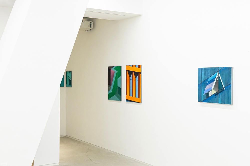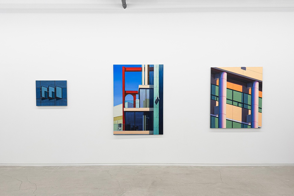 이번 전시에 선보이는 작품은 절제되면서도 빛나는 색조로 특징지어진다. 차가운 녹색과 청색, 황토색과 회색이 주조를 이루며, 창과 난간의 경계에서는 선명한 붉은색과 짙은 갈색이 절제되게 쓰여 화면을 생동감 있게 만든다. 화면 전체는 수평과 수직의 기하학적 구조가 지배하지만, 곳곳에서 날카로운 각도와 비대칭성이 삽입되어 기계적 규칙성을 깨뜨리며 은은한, 마치 싱코페이션과 같은 리듬감을 자아낸다. 특히 대표적인 작품 “3 open window(2025)”는 건물 파사드의 세 개 창문을 같은 각도로 열려 있는 모습으로 묘사한다. 창문 유리의 푸른 면은 아침빛을 수정처럼 투명하게 받아들이고, 그 속에서 겹쳐지는 그림자와 중첩은 회화 내부에 또 다른 공간을 생성한다. 이 작품은 “보이는 것”이 “장면”으로 변모하는 과정을 강렬히 상징한다.