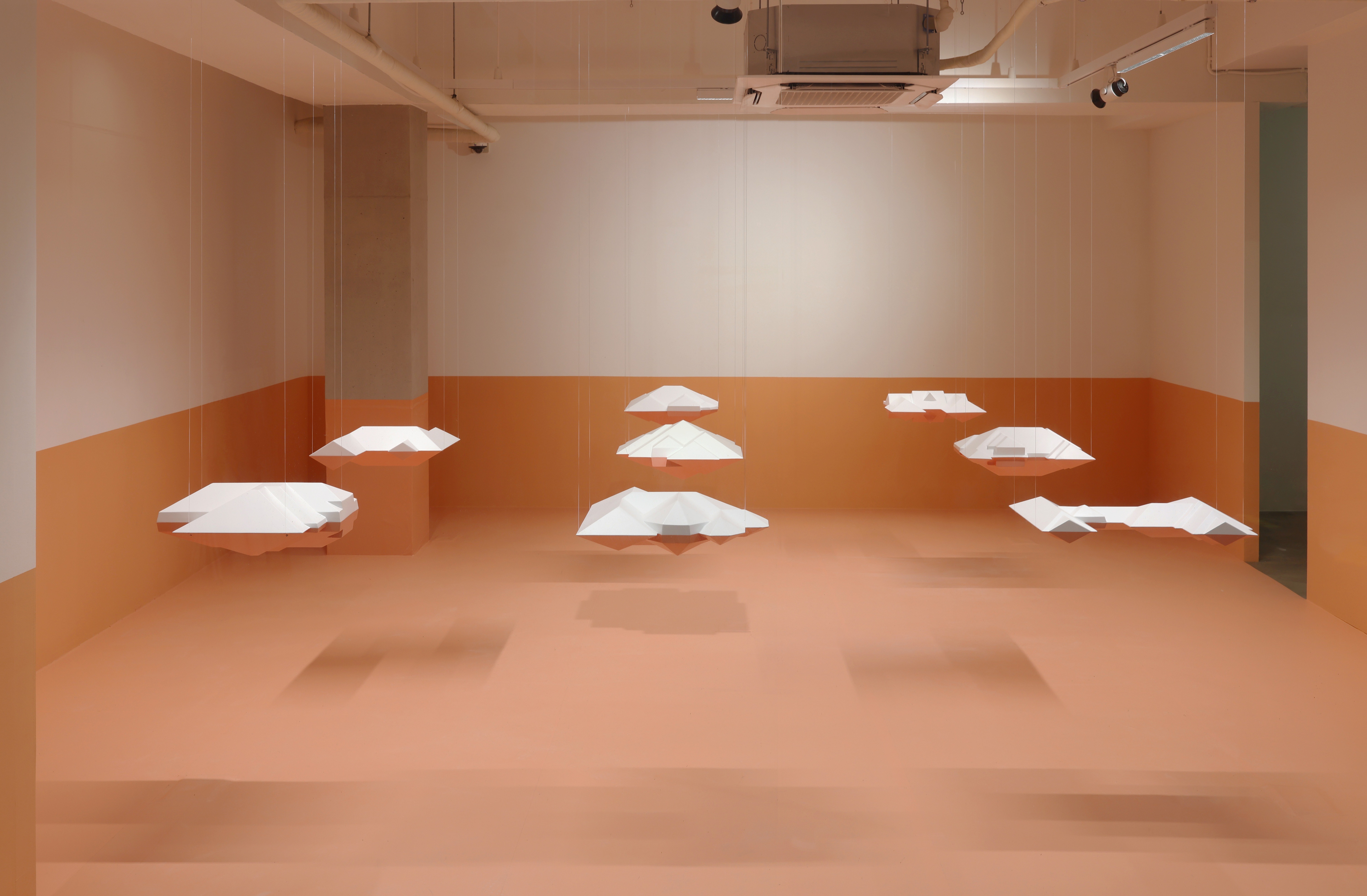 이번 전시의 중심작 〈New Landscape〉는 플로리다의 주거지를 배경으로 한다. 세계적 부유 지역의 상징인 이곳이 자연의 힘 앞에서 무력해지는 아이러니는, 잘 정비된 지붕들이 흙탕물에 잠긴 풍경에서 극적으로 드러난다. ‘풍요와 취약성’이 공존하는 이 장소는 기후위기의 상징적 지점이자, 우리가 믿어온 안전의 이미지가 얼마나 쉽게 무너질 수 있는지를 드러낸다. 작가는 침수된 지붕의 형태를 위아래 대칭 구조로 제시해 ‘수면 위의 반영’이라는 시각적 질서를 만든다. 갤러리의 구조적 특성을 활용해 관객이 계단을 따라 내려가며 작품을 마주하도록 구성한 이 작업은, 마치 실제 수면 아래로 잠겨드는 듯한 신체적 감각을 불러일으킨다. 이러한 ‘침잠’의 경험은 공간과 주제, 조형 언어가 긴밀히 맞물리는 지점을 만들어낸다.