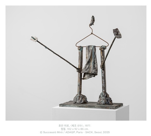 조각의 언어 호안 미로 “나는 정말로 환상적이며 살아 있는 괴상한 것들의 세계를 조각 속에서 창조할 것이다.” — 호안 미로 타데우스 로팍 서울은 카탈루냐(Catalonia) 출신의 거장 호안 미로(Joan Miró, 1893–1983)의 개인전 《조각의 언어》를 개최한다. 본 전시는 세종문화회관(2016)과 마이아트뮤지엄(2022)에서 열린 미로의 대규모 회고전 이후, 국내에서 3년 만에 선보이는 작가의 개인전이다. 《조각의 언어》는 국내에 거의 소개된 적 없는 미로의 청동 조각들을 중심으로 그의 생애 마지막 시기에 집중된 조각 실험을 조명한다. 미로의 조각은 초현실주의적 아상블라주(assemblage)에 뿌리를 두고 있으며, 이러한 조형 실험은 작가의 예술 세계 속에서 점차 핵심적인 위치를 차지하게 되었다. 본 전시에서 선보이는 후기 아상블라주 조각은 미로 특유의 끊임없는 실험 정신이 응결된 결정체로, 일상에서 발견한 사물을 활용해 작가 특유의 조형 언어로 변모시키는 과정이 고스란히 드러난다. 그의 손 끝에서 사물들은 상상력과 시적 감각을 입고 새롭게 결합되며, 하나의 독창적인 조각적 별자리로 재탄생한다. 이에 대해 예술 평론가이자 시인인 자크 뒤팽(Jacques Dupin)은 “미로 특유의 독창적인 조각적 상상력이 가장 순도 높게 드러난 시기”라고 평한 바 있다. 마요르카(Marjorca) 작업실에서 완성된 일련의 작품들은 민속 예술과 공예품부터 해안 식물과 광물에 이르기까지 작가가 발레아레스 제도(Balearic Islands) 에서 수집한 요소들을 담고 있으며, 자연의 요소를 자신만의 고유한 조형 언어로 승화시킨 과정을 살펴볼 수 있다. 한편, 미로의 초기 과슈 회화 한 점과 20세기 가장 영향력 있는 사진가 중 하나인 어빙 펜(Irving Penn, 1917–2009)이 촬영한 미로의 초상 사진 두 점이 함께 전시된다. 미로와 그의 조각 사이의 상호적 관계를 포착한 펜의 사진은 예술가의 존재와 조형 세계가 어떻게 긴밀히 맞닿아 있는지를 섬세하게 드러낸다. 호안 미로는 가족 농장이 있던 카탈루냐 몬트로익(Mont-roig) 주변 시골에서 채집한 식물과 돌들의 형식적 아름다움에서 영감을 얻었다. 그는 1922년부터 조각 실험을 본격적으로 전개했고, 1930년대 초에는 초현실주의적 작품인 〈구성 (Constructions)〉(1930)과 이후 〈시적 오브제(Objets poétiques)〉(1936)를 통해 평면 회화에서 삼차원적 조형으로 영역을 확장했는데, 이 작품에는 박제 앵무새 등 ‘발견된 오브제’가 포함되어 있으며, 미로의 독창적인 조형 감각이 서서히 구체화된 시기로 평가된다. 1944년 도예가 조셉 로렌스 아르티가스(Josep Llorens Artigas)와의 협업을 시작한 미로는 1953년 이 관계를 다시 이어가며 본격적인 조각가로 도약했다. 1960년대 이후, 조각은 미로 예술 세계의 핵심으로 자리잡았으며, 특히 프랑스 남부 생폴드방스(Saint-Paul-deVence)에 위치한 매그 재단(Fondation Maeght)에 설치된 장소 특정적 작품 〈미로의 미로(Labyrinth Miró)〉(1964, 1968, 1973)는 그 정점으로 꼽힌다. 갤러리 안쪽 벽면에 어빙 펜이 1948년 촬영한 미로의 초상 사진 두 점 중 하나에서 미로는 스페인 타라고나에 있는 자택 옥상에서 하늘 아래 자신의 조각들과 나란히 서있다. 다른 사진에서는 미로가 유기적 형태의 청동 조각들을 자신의 품에 안은 채, 펜의 렌즈를 꿰뚫듯 응시한다. 사진에 담긴 작은 청동 조각들은 1940년대 미로의 손끝에서 직접 빚어진, 원초적 볼륨감을 지닌 작품들로 그의 창의성과 인간적 따뜻함을 동시에 보여준다. 전시작 다수는 미로가 마요르카 세르트(Sert)의 작업실에서 제작한 조각들로, 섬에서 수집한 자연물와 잡동사니(bric-abrac)에서 비롯되었다. 나뭇가지, 조약돌, 그리고 마요르카의 전통 민속 도자기 피리인 ‘시우렐(siurells)’까지 그가 택한 소재는 다채롭고 각기 다른 매력을 지닌 동시에 모두 일상의 흔적을 지니고 있다. 미로는 손자 호안 푼옛 미로(Joan Punyet Miró)에게 이렇게 말했다. “산책할 때 마치 버섯을 찾듯이 일부러 사물을 찾는 건 아니야. 어느 순간 갑자기 쾅! 하고, 마치 자석에 끌리듯, 자연스럽게 눈이 멈춰.” 그는 이렇게 수집한 오브제들을 작업실 바닥에 흩어 놓고, 본능적으로 조합해 ‘시적 충격(poetic shock)’을 불러일으키는 형태로 배열한 뒤, 이를 청동으로 주조해 시간의 흔적 속에서도 변치 않는 조각으로 완성했다. ‘꿈의 자동기술(oneiric automatism)’을 바탕으로, 미로는 가장 단순하고 소박한 소재에서 고도의 시적 조형을 이끌어냈다. 그의 가까운 친구 호안 프라츠(Joan Prats)가 농담처럼 말했듯, “내가 돌을 집으면 그저 돌이지만, 미로가 돌을 집으면 그것은 곧 ‘미로’ 그 자체가 된다.” 《조각의 언어》는 미로가 자신의 조각 작업을 통해 불러일으키고자 했던 ‘새로운 세계에 발을 들여놓는 듯한 거대한 감각’을 다시 환기한다. 한 작품에서는 옷걸이와 대나무, 플라스틱 파편이 곧 공연을 펼칠 듯한 생동감 넘치는 체조 선수로 탈바꿈되고, 또 다른 작품에서는 야자나무 그루터기 위에 놓인 합성 고무와 뒤틀린 병 조각들 사이로 토템적 포옹을 나누는 한 쌍의 인물이 된다. 특히나 미로는 각 오브제에 잠재된 ‘영적’ 에너지를 이끌어내어, 겉보기에 서