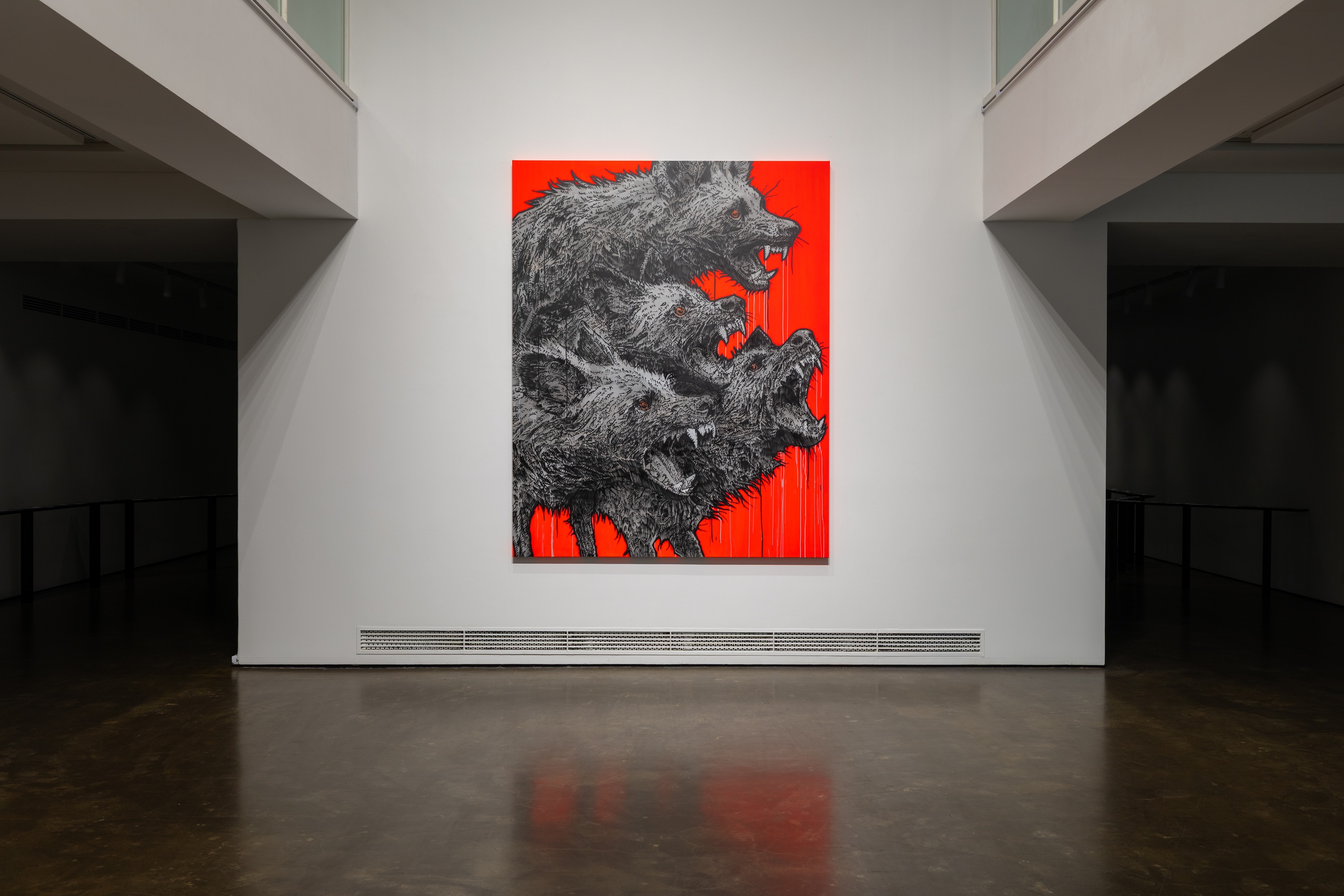 보이는 목소리 들어가며 만화와 힙합을 좋아하던 소년 지알원[1]은 2000년, 청소년 시절 그의 고향인 부산에서 첫 그래피티를 제작했다. 이후 그는 ‘최대한 많이, 최대한 위험한 곳에’ 자신의 흔적을 남기는 모험과도 같은 여정을 시작한다. 대학 졸업 후 시카고의 한 신문사에 취직한 뒤에도 그는 퇴근 후 스케치를, 주말에는 거리를 누비며 그래피티 작업을 이어갔다. 폐공장에 무단 침입해 8층까지 계단 손잡이 봉을 타고 올라가 그래피티를 남기다 체포되었던 어느 날의 이야기는 이제는 웃으며 꺼내는 하나의 에피소드다. 그러나 당시의 살벌했던 상황을 떠올려 보면, 그러한 (무모한) 용기를 쉽게 낭만화하기는 어렵다. 그럼에도 불구하고 그는 그래피티를 멈추지 않았다. 아니, 오히려 스프레이 통을 더 세게 쥐었다. 이러한 지알원의 삶의 궤적은 전설이나 설화처럼 들리기도 한다. 다만 그것은 어떤 영웅담이 아니라 그가 보여준 그래피티적 태도의 연대기에 가깝다. 이번 개인전은 바로 그 태도가 문법이 되고, 문법이 시각예술로 발화되는 지점을 따라간다. Chapter 1. 그래피티의 확장 지알원은 분명 그래피티에 기반을 두지만 그 정체성에 갇히지 않는다. 그의 작업은 평면 회화뿐 아니라 다양한 매체와 형식으로 확장되며 미술 장르의 경계를 자유롭게 넘나든다. 한국을 비롯하여 미국, 아시아 전역을 오가며 그래피티 아트를 폭발적으로 생산해 내던 그가, 2013년경부터는 특히 동아시아의 주요 도시를 누비며 특정한 주제, 즉 내러티브를 가진 대형 그래피티 프로젝트를 다수 진행한다. 회화의 문법으로 풀어낸 거리의 작업은 자연스럽게 순수미술로 연결된다. 이야기를 가진 그래피티는 더 이상 즉흥적 흔적에 머무르지 않았으며, 화면을 구성하는 조형 언어로 진화했다. 2019년 소마미술관 드로잉센터에서의 개인전을 기점으로 그는 본격적으로 제도권 미술계에 진입한다. 지알원 회화에서 눈에 띄는 속도감, 화면을 가득 채우는 밀도, 차분하고 고상한 붓질과는 대척점에 있는 일필휘지의 폭발적 제스처는 모두 거대한 벽을 상대로 몸 전체를 사용해 작업하던 관성과 에너지가 응축된 결과이다. 또한 그의 작품은 직시성이 매우 뚜렷하다. 의미를 쉽사리 파악하기 어려운 개념적 미술이 아니라, 달리는 차 안에서 보아도 찰나에 각인될 수 있는 방식이다. 이러한 지점 역시 그래피티의 속성과 연결된다. 질료적 특징도 그러하다. 지알원은 물감 대신 그래피티 재료인 스프레이와 아크릴 마커를 작업의 주된 소재로 사용한다. 독특한 점은 그의 회화에서 두드러진다. 정통 그림의 바탕재가 되어 왔던 캔버스 위에 그림을 그리고는 있으나, 작품 제작에 앞서 특별한 표면 처리 과정을 거친다. 그는 종종 아크릴 보조제를 발라 캔버스에 거친 요철을 만든다. 이는 일반적으로 그래피티가 제작되는 벽의 불균질하고 거친 물성을 표면 위로 전이시키려는 시도이다. 그래피티 아티스트들은 각자 고유한 스타일을 구축하고 이를 반복적으로 사용한다. 지알원의 그래피티 스타일은 마치 번개가 사방으로 뻗어 나가듯 날 선 선들이 연쇄적으로 분출되는 형상으로 이루어진다. 이러한 특징은 그의 순수 작업 전반으로 확장되는데, 회화에서는 삼각형과 다각형으로, 조각에서는 주로 뿔을 연상시키는 구조로 나타난다. 그래피티에서 비롯된 시각적 형태가 연장되면서 지알원 작업 전반에 걸친 일관된 조형적 문법을 만들어 냈다. 다시 한번 강조하는 것은, 그의 회화가 단순히 그래피티를 화면에 옮기는 데 머무르지 않는다는 점이다. 결국 그의 작업이 향하는 지점은 그래피티의 외형과 활동 경계는 물론이며 그 대상까지도 아우르는 확장적 태도에 있다. 지알원은 이를 통해 그래피티를 이미지에 머무르게 하지 않고, 하나의 실천적 방법론으로 전환함으로써 동시대 미술에서 유효한 조형 원리로 발전시킨다. Chapter 2. 지알원이 여기에 있었다 들개 이번 전시 《Grrr!》는 지알원이 처음 그래피티를 시작했던 시점부터 현재에 이르기까지의 작업 전반을 집약적으로 조망한다. 전시장 입구에서 관객을 맞이하는 작품 〈개들이 짖는다〉(2025)는 지알원의 정체성을 단번에 각인한다. 지옥의 문을 지키는 케르베로스를 연상시키는 이 개들은, 전시의 제목처럼 으르렁거리는 소리 ‘grrr!’를 시각화한 대상들이다. 케르베로스가 지옥의 문을 지키는 존재라면, 지알원은 무엇을 지키고 있는가. 그는 거리위의 존재들을 길들지 않은 들개에 비유한다. 그러나 무작정 공격적인 존재가 되겠다는 것은 아니다. 비주류와 주류를 가르는 제도의 폭력성에 맞서, 오히려 지키고 드러내기 위해 으르렁거리는 존재에 가깝다. 그의 작업에 등장하는 대상들은 주로 사회의 주변부에 머물다 사라지거나, 잊히거나, 혹은 끝내 주변에 남겨진, 주목받지 않는 존재들이다. 이처럼 지알원은 주변부에 머물던 것들을 지속적으로 작업에 소환한다. 이 과정에서 비주류 문화와 존재들에 대한 연대의 감정이 작업의 동력으로 작용한다. 그는 이들을 작품의 위치로 끌어올려 ‘여기에 분명히 있었다’라는 존재적 사실을 발언한다. 작업에 자주 등장하는 형광