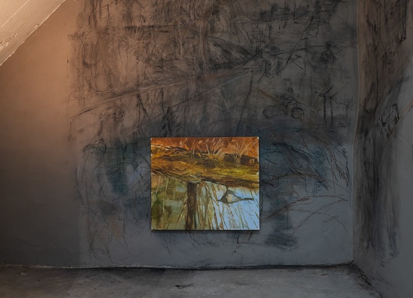 (회화) 물거울(Mirror of Water), 2026, oil on canvas, 53×45.5cm. (벽화) 갈무리(After Gathering), 2026, charcoal and pastel on wall, dimensions variable.