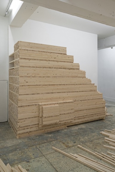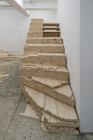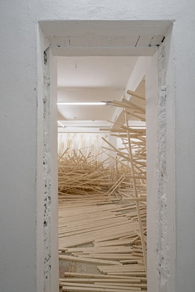 전시의 제목이자 작품의 제목이기도 한 『왜 자기 방 정리를 해야 하는가 혹은 왜 하지 말아야 하는가』는 본질적으로 같은 대상에서 출발하여, 동일한 재료를 사용하고, 같은 시간선상에서 두 가지의 서로 다른 행위를 반복하면서 확인하게 되는 것들, 이를 테면 당연히 존재했던 대상을 의식적으로 설명하거나 정의할 때 맞닥뜨리게 되는 갑작스러운 당혹감, 그것을 인식의 체계 안에 끌어들일 때마다 벌어지는 수많은 시행착오의 순간들, 철저한 계획과 복잡한 수치들의 기록을 통해 파악하려고 해도 늘 예상을 벗어나는 경험들에 관한 이야기다. 전시장 한 가운데에 푹 파인 것처럼 자리한 옛 비상탈출로는 그것의 생김새와 오래된 건물이 지닌 구조적 특징으로 인해 이곳을 찾는 이들에게 자주 기억되는 공간이기도 하다. 작가는 20일 남짓한 시간동안 이 공간을 자로 재고, 수치를 적고, 나무를 자르고, 순서를 정하여 맞추고, 다시 놓는 과정을 무한 반복하면서 어지럽히고, 정리된 상태로 옮긴다. 절반은 각을 맞춰 정리된 상태로, 나머지 절반은 어지럽힌 채 제시된 상황은 비상탈출로의 부피를 가득 채운 정량의 목재를 각각 사용했음에도 불구하고, 그것은 서로 다른 시각과 행동이 동원되어야만 간신히 인식 가능한, 아니 어쩌면 완전하게 파악하는 것이 애초부터 무의미할지 모를, 이상한 덩어리들의 대치상태로 귀결된다. 충분히 익숙할 만한 시간을 거쳤음에도, 그 결과적으로는 굉장히 낯선 두 개의 상황으로 번역된 상황들이다.