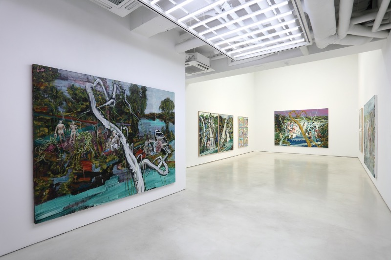 전시장 입구에 들어서면 나란히 놓인 6개의 동시대의 일상적 모습이 마치 ‘밈(Meme)’이나 ‘짤’과 같은 가벼운 이미지가 맞이하며 밝고 경쾌한 느낌으로 시작된다. 하지만 전시장 안으로 들어서면 이내 강한 붓터치와 세밀한 묘사, 그리고 층층이 쌓아 올린 질료들이 엉킨 무거운 작품들과 맞닥뜨리게 된다. 또한, 즉흥적이고 화려한 색감의 작품들과 무거우며 성스럽기까지 한 작품들이 이질적으로 곳곳에 포진하며 관람자에게 궁금증의 미궁 속으로 빠져들게 만들며 혼란을 가중시킨다. “눈먼자의 숲에서 메두사를 보라” 가장 먼저 숲과 서양 고전 명화에 나올 듯한 신화적 이미지가 눈에 들어온다. 숲은 아마존의 원시림과 같이 나무를 휘감은 칡넝쿨이 복잡하게 얽혀 관람자에게 숨겨진 암호를 찾는 난해한 과정을 예고한다. 이어서 신화 속의 인물 디오니소스, 아르테미스, 오이디푸스 등 원작과 출처 그리고 역사적 배경지식을 쌓지 않으면 해석하기 힘든 복잡한 이야기 구성을 펼쳐 놓는다. 이는 작가의 다양한 독서와 동서양 명화의 감상체험 그리고 철학적 사상이자, 본질을 찾아가는 과정에 숨어있는 맥거핀의 연속으로 비밀을 풀어야 하는 대상으로 인식하며 긴장감을 높인다. 그러나 작품에서 주는 메시지는 명료하다. 작가는 “신화에서 메두사의 무섭고 흉측한 모습과 돌로 만드는 능력이라는 설정은 아마도 사회라는 대타자가 주는 경고의 알레고리일 것이다. 이는 개인의 의지와 생명, 감각의 가능성은 석화되면 안 된다는 것을 메두사를 통해서 경고하고 있다.”라고 말한다. 눈먼 자의 숲은 눈을 가림으로 감각의 예민함을 회복하고, 공정성을 담보하며, 시각을 배제하여 예민해진 감각과 어둠의 사유를 통해 만나는 새로운 세상으로 회귀를 의미함을 설명한다. 그리고 코라(chora)상태로 소환함으로서 시적 언어나 발화 이전의 미분화 감각의 숲으로 인도함에 있다고 화면에 나타난 수많은 메타포(metaphor) 속에 본질을 이야기하고 있다. 마치 스스로 벌하고 눈뜨기 이전상태로 자신을 돌려버리는 오이디푸스의 결단이, 소멸을 통해 재탄생한 것과 같이 대중이 무뎌진 감각의 회복을 시도하여 원초성의 회복을 꿈꾸는 것과 같은 의미이다. “낯선 숲의 일탈자들” “우리가 꿈을 꾸다가 깨어나면 꿈속에서는 해도 되는 일들이 사회적인 통념, 가치관, 선악의 기준으로 ‘슈퍼애고(superego)’라는 초자아가 억압시킨다. 그래서 현실에서 억압된 것들이 변형되어 나타나는 것이, 밈, 환각, 이상한 행동 등에서 나타난다”라고 작가는 말을 한다. 작품에 일탈자들은 현실이 마냥 꿈같이 느껴진다. 일상에서 벌어진 많은 일이 꿈속에서 느껴지는 매트릭스와 같이 현실이 꿈일 수도 있는 것이다. 꿈같은 형상들이 비이성적이며 일탈적인 것, 인간의 욕망을 표출하는 것, 익숙한 낯선 숲이지만 꿈같은 낯선 숲을 조성하고 현실을 대입하는 것들이 제한이 없이 표현되고 있다. 인터넷에서 떠도는 가벼운 이미지를 수집하며 또 다른 자아의 실체를 찾으려는 노력의 연장선에 있는 시도이며 신화, 철학, 역사 등을 섭렵하면서 현실에서 도달할 수 없는 유토피아에 대한 회의적 사고의 산물인 것이다. “지난 시대는 개인의 욕망이 밖으로 표출 할 수 있는 사건들이 있었지만, 현시대에는 점차 소실된 한정적인 공간에서 내적 새로운 공간인 매트릭스 세계 즉, 증강현실로 찾아 들어간다. 기억을 통해 가상세계로 들어가면 모든 것들이 균등하게 배열한다. 화엄경의 세계 즉, 모든 사람이 자신의 욕망과 의지를 실현할 수 있는 세계가 현실적으로 가능한 유토피아는 영적 차원의 세계가 아닌가 생각한다.”라고 작가는 말한다. 실제 일론 머스크가 인간의 뇌에 칩을 심으며 서로 마인드 퐁(mind pong)하며, 기억을 저장하고 재생하는 시도가 실현되고 있다는 점에서 설득력을 가진다. 그러므로 작가는 ‘낯선 숲의 일탈자들’을 통해, 모든 감각의 기준인 몸을 억압하는 많은 이성적 체계와 규칙에 얽매이지 않고 감각과 욕망을 마음껏 표출할 수 있는 낯선 숲의 유토피아와 현대적 히피 행동의 일탈자들을 통해 나 혹은 우리를 대신한 일말의 희망을 보여준다. “이야기가 어렵지 그림은 어렵지 않다.” 작가는 “우주의 생성이 수만년 걸린다고 생각했는데, 빅뱅이론에 의하면 짓눌려 있는 수많은 물질이 한 번에 폭발하여 1초 만에 생성된다고 한다.”라고 이야기하며 화가의 붓질 속에서도 미리 내재 되어 있는 잠재성이 일회성인 기운생동으로 나타난다고 말한다. 2년이 채 안 되는 작업의 변화과정을 선보이는 이번 전시에 담론의 깊이와 심오한 작업에서 일회성에 중점을 두며 손과 질료가 맞닿은 느낌의 붓질이 두 번 가지 않는 감각적 극대화를 보여주려는 것이다. 회화를 중심으로 오브제, 설치, 사진, 미디어아트, 퍼포먼스, 실험영화까지 다양한 활동을 해온 작가이기 때문에 지금의 변화도 크게 놀라울 일도 아니다. 작품의 내용적인 면인 신화, 철학, 정신분석학 그리고 이를 위한 표현형식인 포스트모더니즘까지 4가지의 코드에 대한 경계를 넘나드는 이러한 실험은 관객 스스로가 스펙트럼을 넓히고 이미지에 