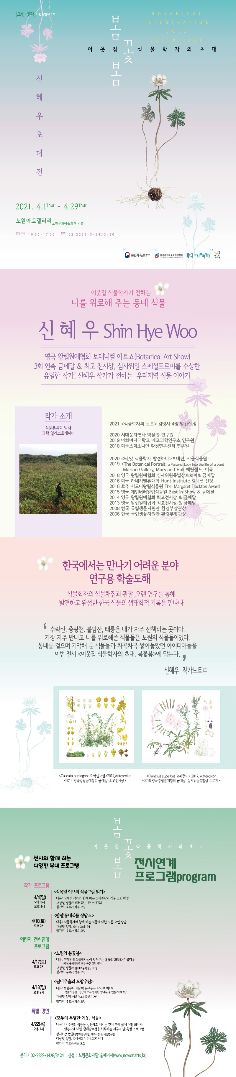 나를 위로해 주는 동네 식물, ‘봄꽃’을 보다. 식물학자이자 과학 일러스트레이션 아티스트인 신혜우 작가의 <이웃집 식물학자의 초대, 봄꽃봄> 전시가 4월 1일부터 29일까지 노원문화예술회관 4층 노원아트갤러리에서 개최됩니다. 영국왕립원예협회 보태니컬 아트쇼(Botanical Art Show) 3회 연속 금메달과 최고 전시상, 심사위원스페셜 트로피를 수상한 작가이자 식물분류학 박사인 신혜우 작가의 이번 전시는 봄과 꽃, 봄을 이야기합니다. 불암산, 수락산, 중랑천 등에서 수집한 봄꽃을 주제로 식물 세밀화와 봄꽃 표본, 봄 식물 종자 전시가 식물이야기와 함께 펼쳐집니다. 이웃집의 식물학자가 선사하는 봄꽃의 과학과 아름다움으로 우리 동네 봄의 향연을 만끽할 수 있는 특별한 자리에 여러분을 초대합니다.