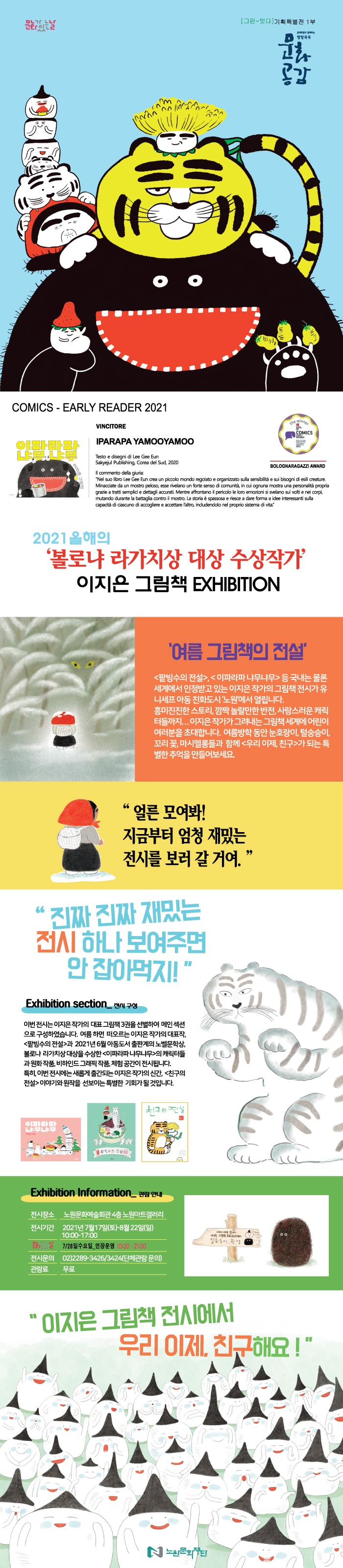 2021년 어린이책 출판계의 노벨상, 볼로냐 라가치상을 수상한 이지은 작가의 그림책 전시회. <팥빙수의 전설>, <이파라파 냐무냐무>등 국내는 물론 세계적으로 주목받고 있는 이지은 작가의 그림책 속 캐릭터들을 만나고, 6월 출간한 따끈따끈한 신작, <친구의 전설>이야기를 들을 수 있는 특별한 기회에 여러분을 초대합니다. ■ 부대프로그램 : 임영주박사 특별강연<그림책으로 공감하는 아이의 세계>, ARTIST TALK<이지은 그림책의 전설>, <우리 이제, 친구 그림책여행>, KID ART PROGRAM<냐무냐무 맛있는 이야기>, 어린이 아뜰리에, 어린이 전시해설 프로그램 운영 (출처=노원아트갤러리)