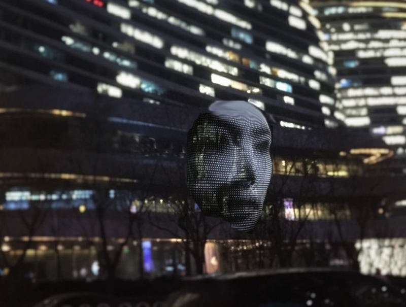 실제 인물의 평면 LED 컬러 영상이 얼굴모형의 입체 구조물 위에 투여되지만 관객은 3D로 재 가공된 인공의 이미지를 보게 된다. 3D 모션 그래픽 motion Graphic을 이용해 인공지능AI, 사이보그Cyborg, 아바타Avatar 의 느낌을 표현하고자 했다.