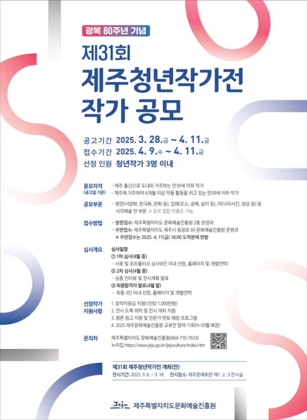 제주특별자치도문화예술진흥원은 광복 80주년을 기념하여, 제주 청년작가들의 창의적이고 다양한 조형 언어를 통해 지역 미술문화의 미래를 이끌어갈 작가를 발굴하고자 「제31회 제주청년작가전」에 참여할 작가를 아래와 같이 공모합니다.