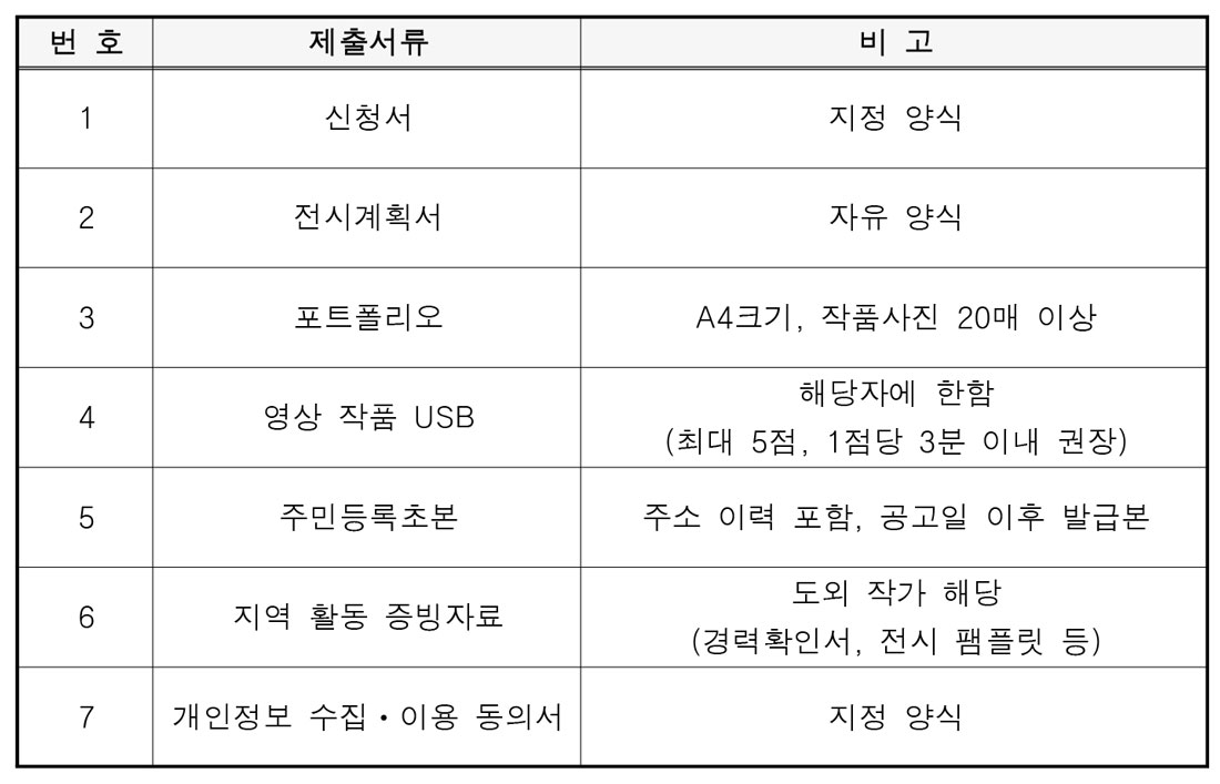 | 지원| | 선정 작가 지원사항 ❍ 창작지원금: 1인당 10,000,000원(일천만원) ❍ 전시 개최 지원(도록 제작 등) ❍ 평론 원고 지원 및 전문가 멘토 매칭 프로그램 제공 ❍ 제주문화예술진흥원 도외 교류 전시 참여 기회 부여(9~10월 예정) |