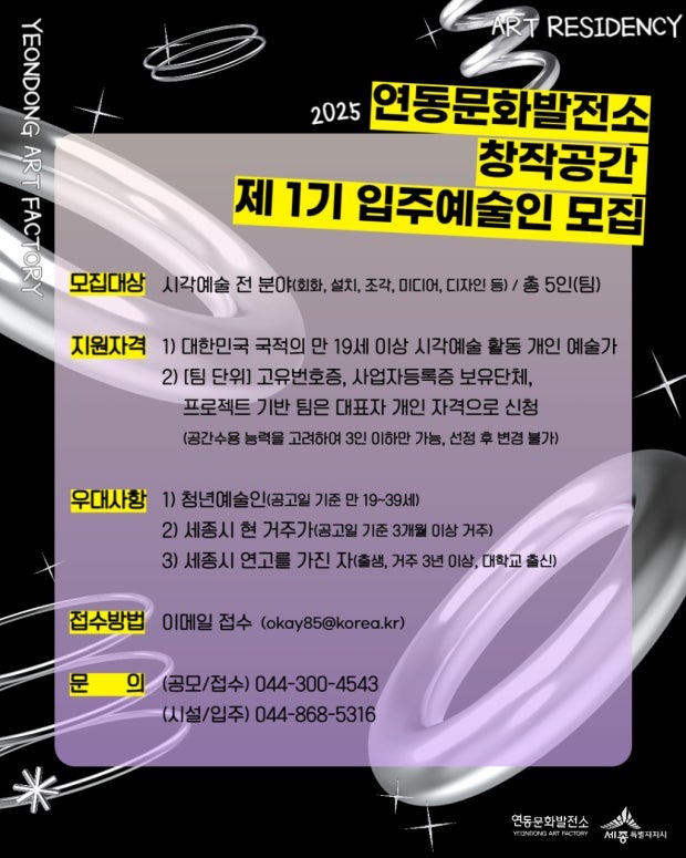 연동문화발전소는 세종특별자치시에서 운영하는 문화예술창작, 교육·체험공간으로, 역량있는 예술가들의 창작활동 및 창작공간 지원하고자 합니다. 연동문화발전소에 입주하여 창의적이고 활발한 창작활동을 펼쳐나갈 예술인을 아래와 같이 모집하오니 많은 관심과 참여 바랍니다.