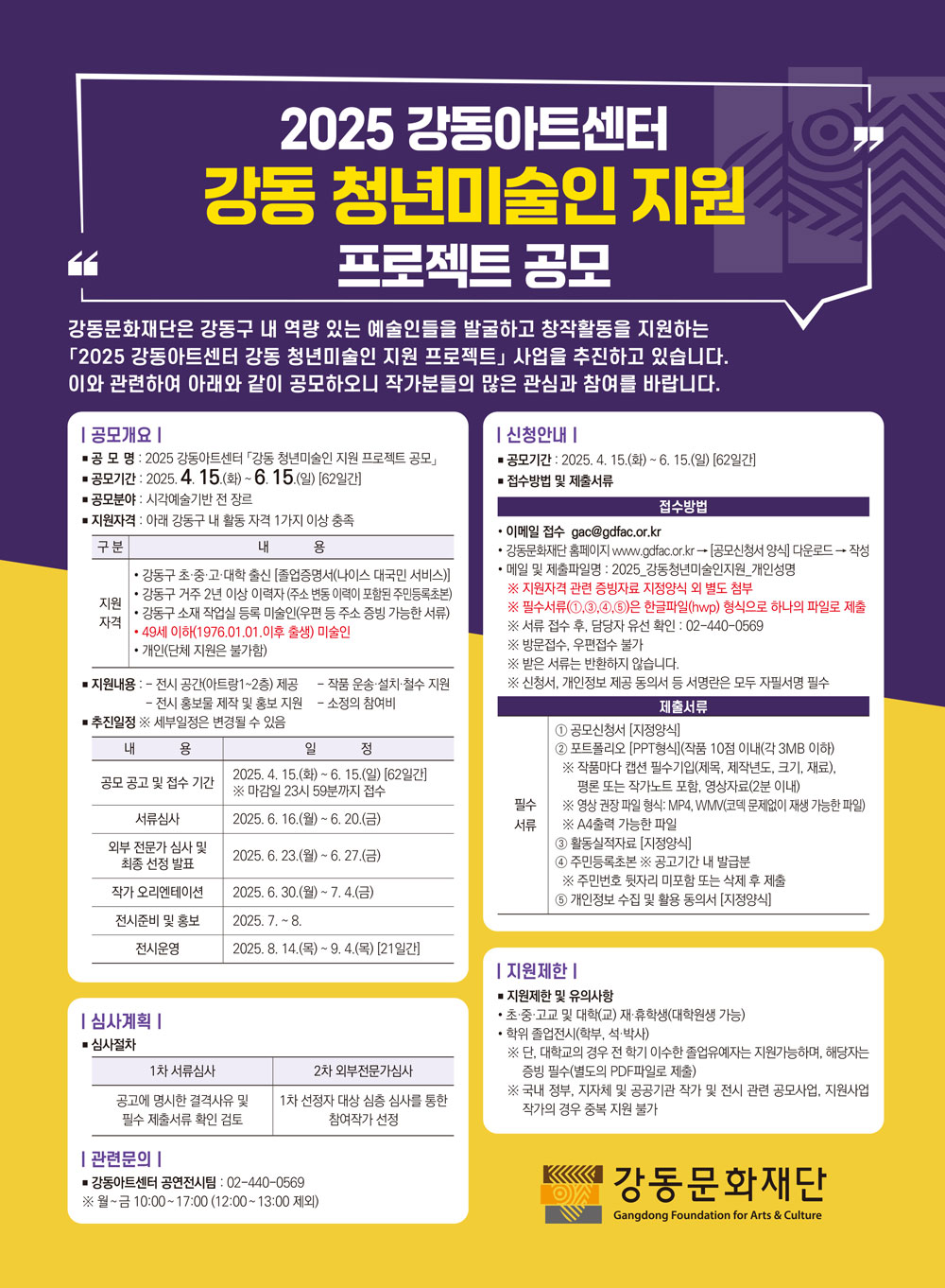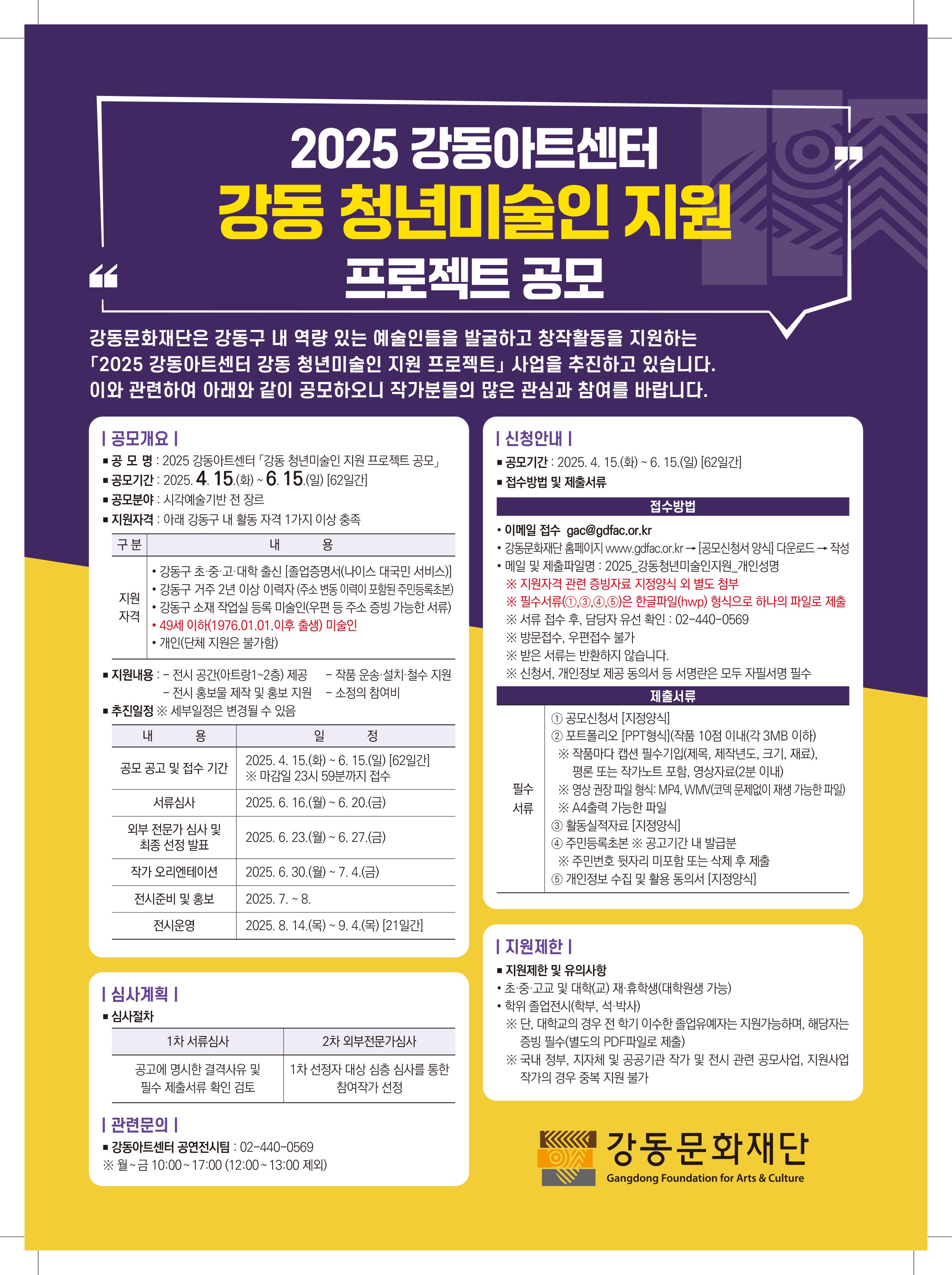 강동문화재단은 강동구 내 역량 있는 예술인들을 발굴하고 창작활동을 지원하는 「2025 강동아트센터 강동 청년미술인 지원 프로젝트」 사업을 추진하고 있습니다. 이와 관련하여 아래와 같이 공모하오니 작가분들의 많은 관심과 참여를 바랍니다.
