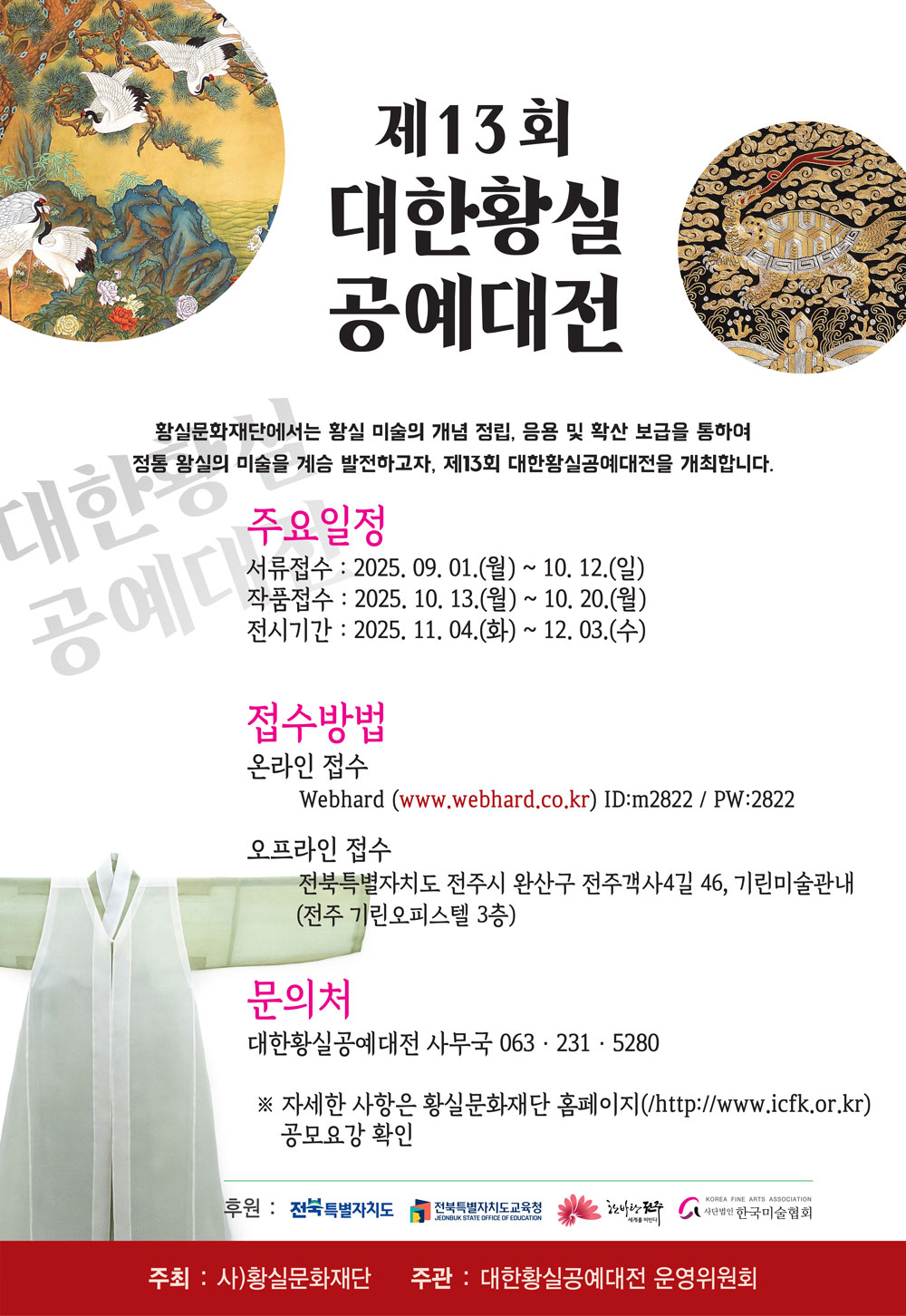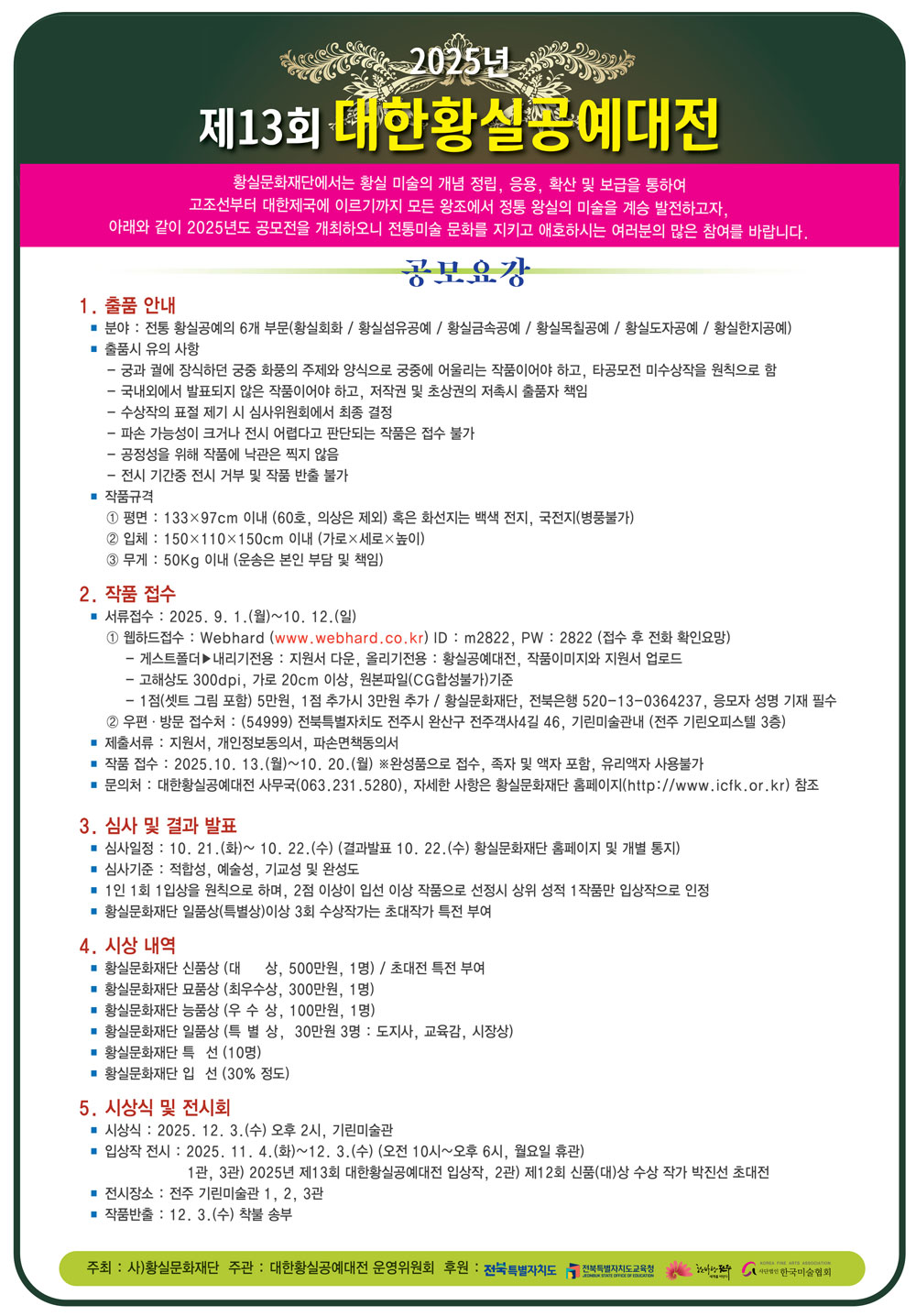 황실문화재단에서는 황실 미술의 개념 정립, 응용 및 확산 보급을 통하여 고조선부터 대한제국에 이르기까지 모든 왕조에서 정통 왕실의 미술을 계승 발전하고자, 아래와 같이 2025년도 공모전을 개최하오니 전통미술 문화를 지키고 애호하시는 여러분의 많은 참여를 바랍니다.