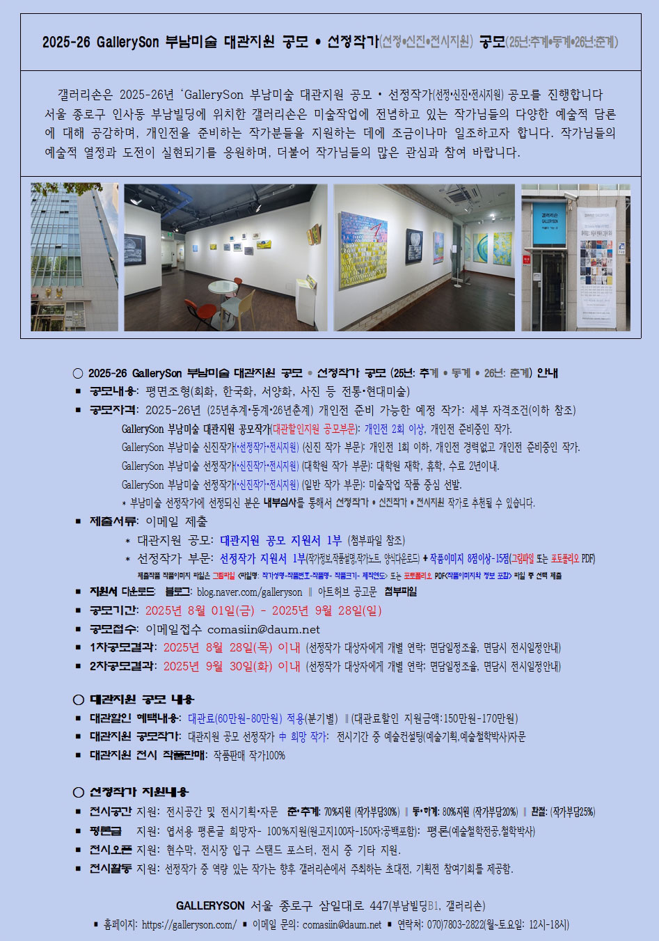 ○ 2025-26 GallerySon 부남미술 대관지원 공모 • 선정작가 공모 (25년: 추계 • 동계 • 26년: 춘계) 안내