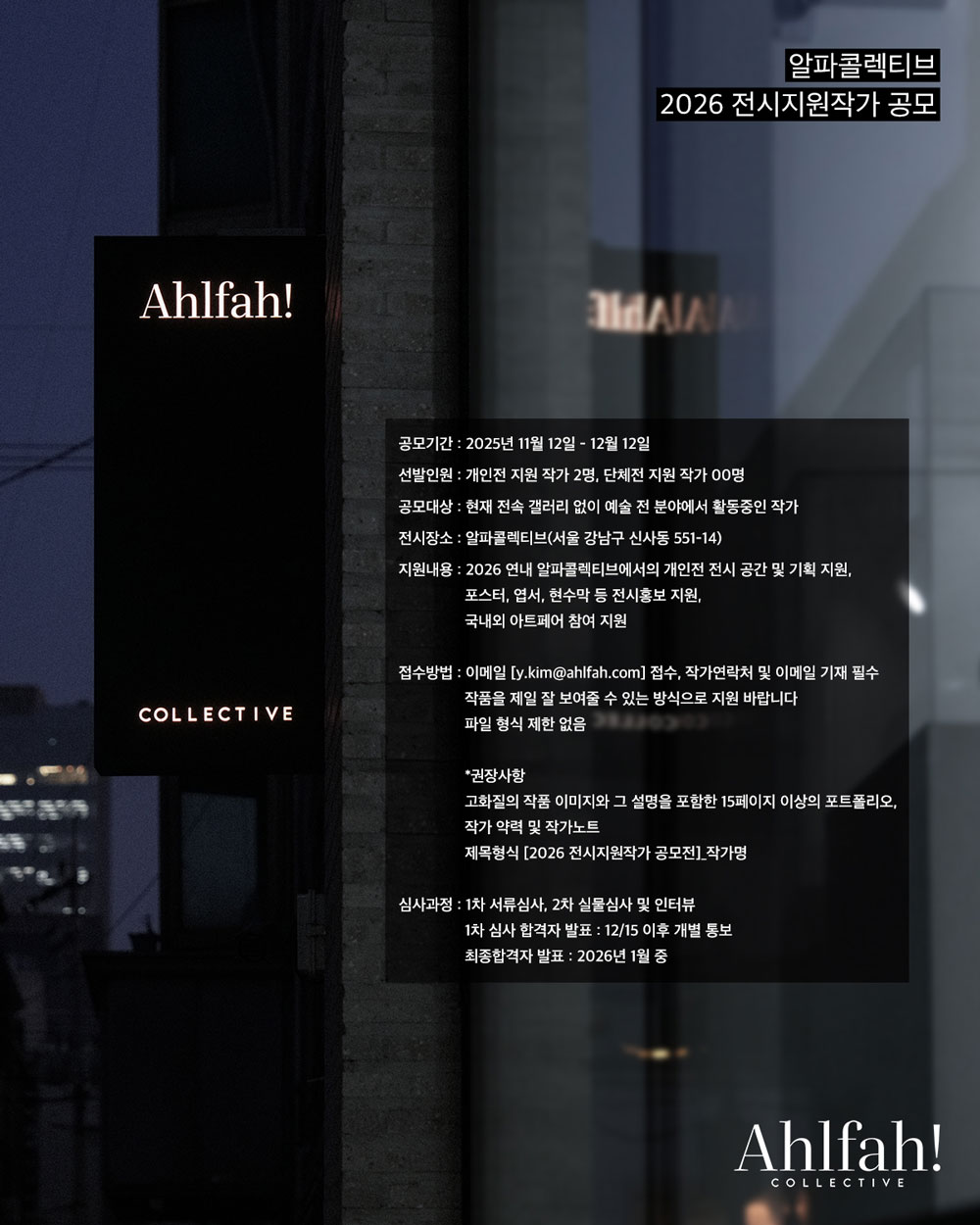 2026년을 맞아 좋은 전시, 아름다운 작품의 즐거움을 함께 느낄 더 많은 손들을 만나보고자 알파콜렉티브의 첫번째 전시지원 작가 공모전을 개최합니다.